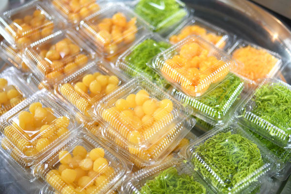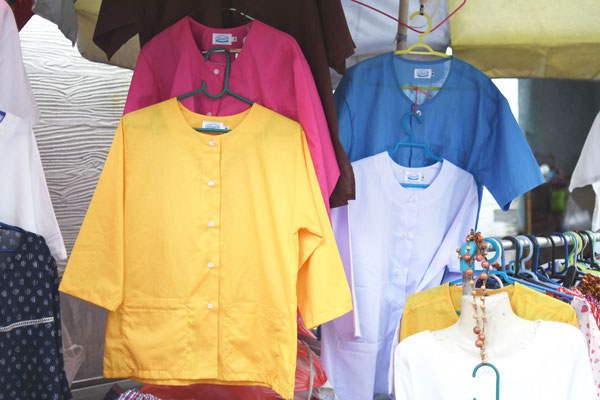 ブリキ屋さんを出ると、下町らしく、細い路地がちょっとした市場になっていて、お惣菜やおやつを売る屋台が並んでいます。果物も美味しそう。昔ながらの部屋着もかわいいな。ベトナムにも似たようなのがあったなあと思って写真を撮りました。生活の気配が濃く、密集した家や玄関先を見て歩くだけでも楽しいエリアでした。