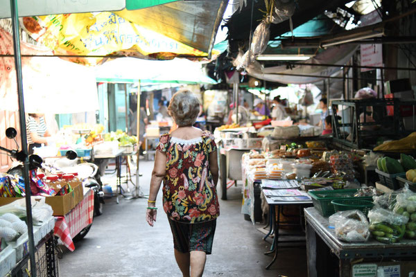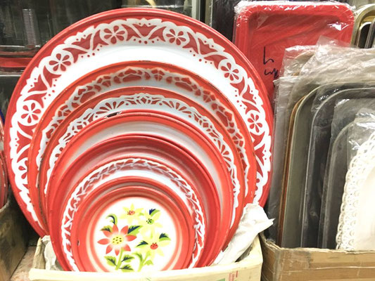 チープな雑貨が中心ですが、布や素材は品ぞろえの良い店が数軒あります。ここではチェック柄のマルチクロス「パーカオマー」をたっぷり選びました。ほかには台所用品のお店でホウロウの食器やガラス製品などを。タイの花柄のホウロウ製品は昔から大好き。今も市場などで現役で使われているのをよく見かけます。