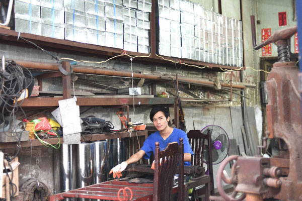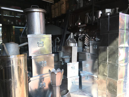 1日目はチャイナタウン(ヤワラート)方面へ出かけました。しばらく歩いていくと、早速気になるブリキのお店を見つけました。ぐるりと見回すと奥に工房があってここで作っている様子。ダクトなどの設備に使う大きな製品も多いけれど、蓋つきのボックスやじょうろなど、ふだん使えるかわいい雑貨もいろいろあるみたい。職人さんも優しく、いろいろと手に取って見せてもらいました。中でも蓋つきのボックスがかわいくて、裁縫箱くらいのをサイズ違いで注文することにしました。ちょっと手作り感が残っていて荒っぽい仕上げもいい。奥で作業しているお兄さんに「写真撮っていい?」とカメラを向けると、ビシッとカメラ目線でこたえてくれました。