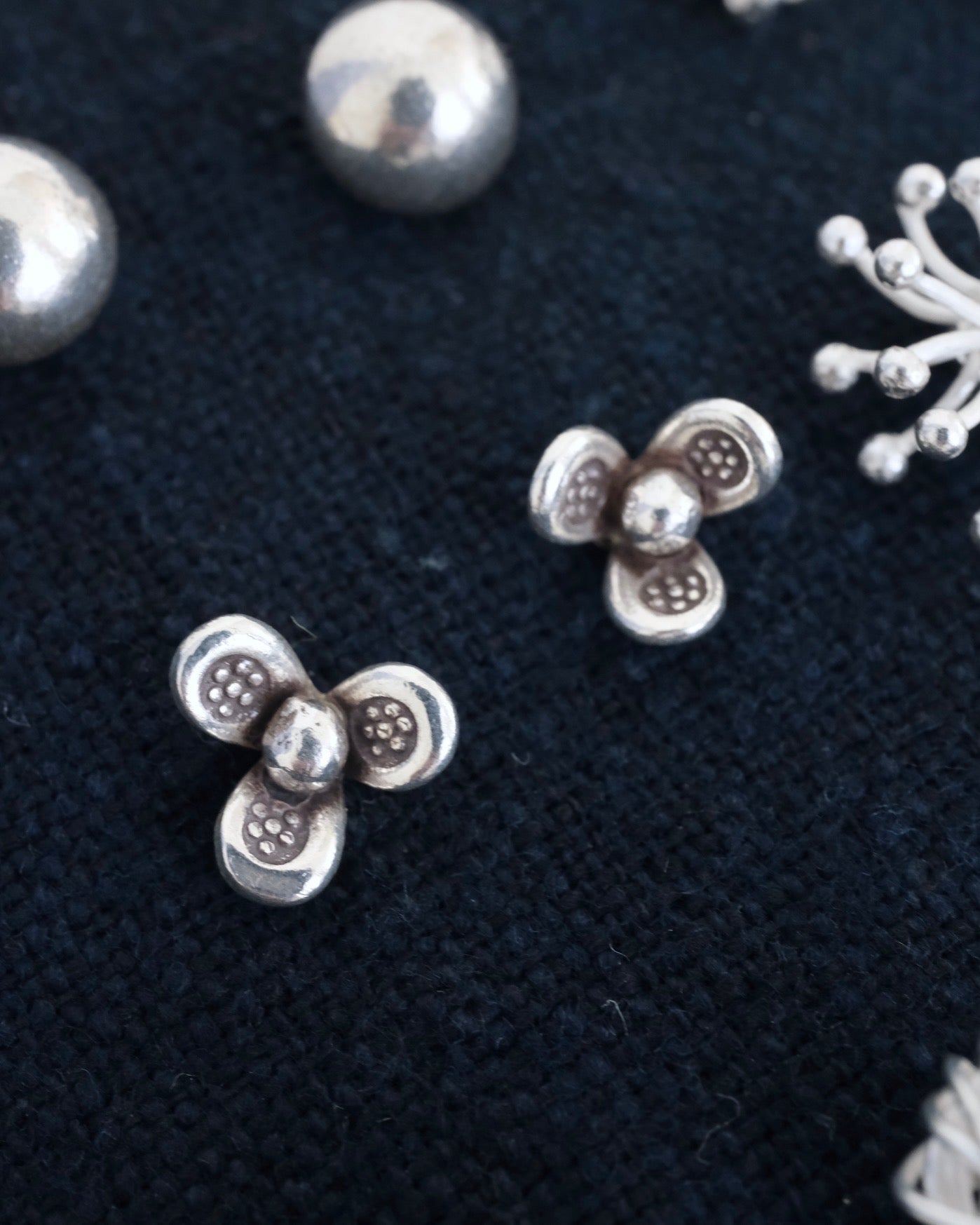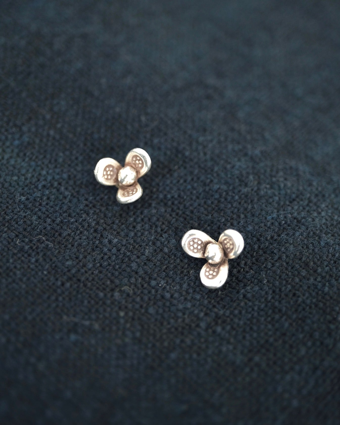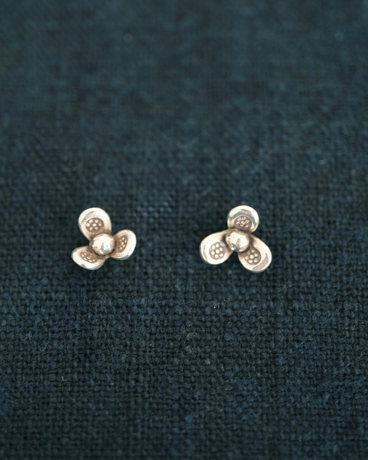 タイ・チェンマイの山岳民族カレン族が作る「カレンシルバー」のパーツを使ったピアスです。耳の穴にまっすぐ通してキャッチで留めるスタッドタイプ。「トリオブルーム」は3つの花弁の花がモチーフ。