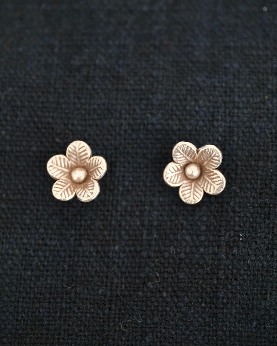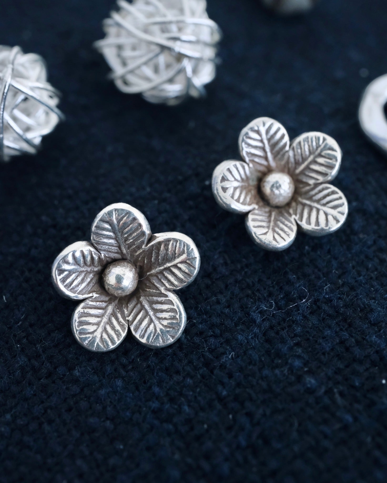 タイ・チェンマイの山岳民族カレン族が作る「カレンシルバー」のパーツを使ったピアスです。耳の穴にまっすぐ通してキャッチで留めるスタッドタイプ。「ブロッサム」はきれいに満開になった花がモチーフになっています。