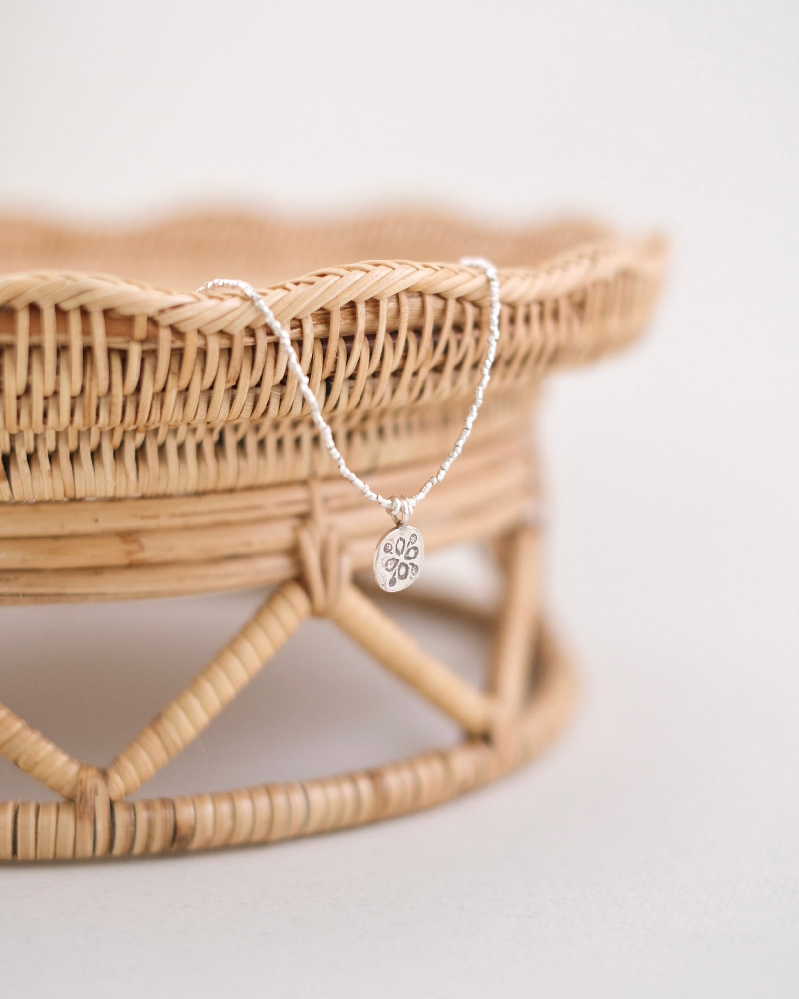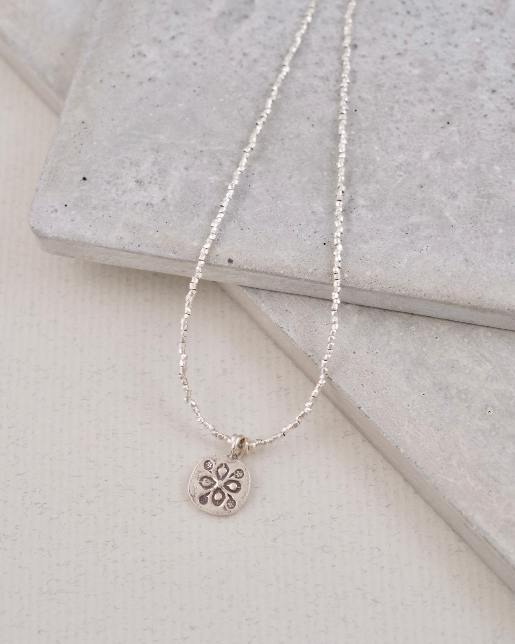 1.2mm程の小さなシルバービーズにはカットが入っていて、小粒で繊細ながら、角度によってキラキラと輝きます。中心の刻印模様のラウンドチャームがアクセントになったネックレスです。