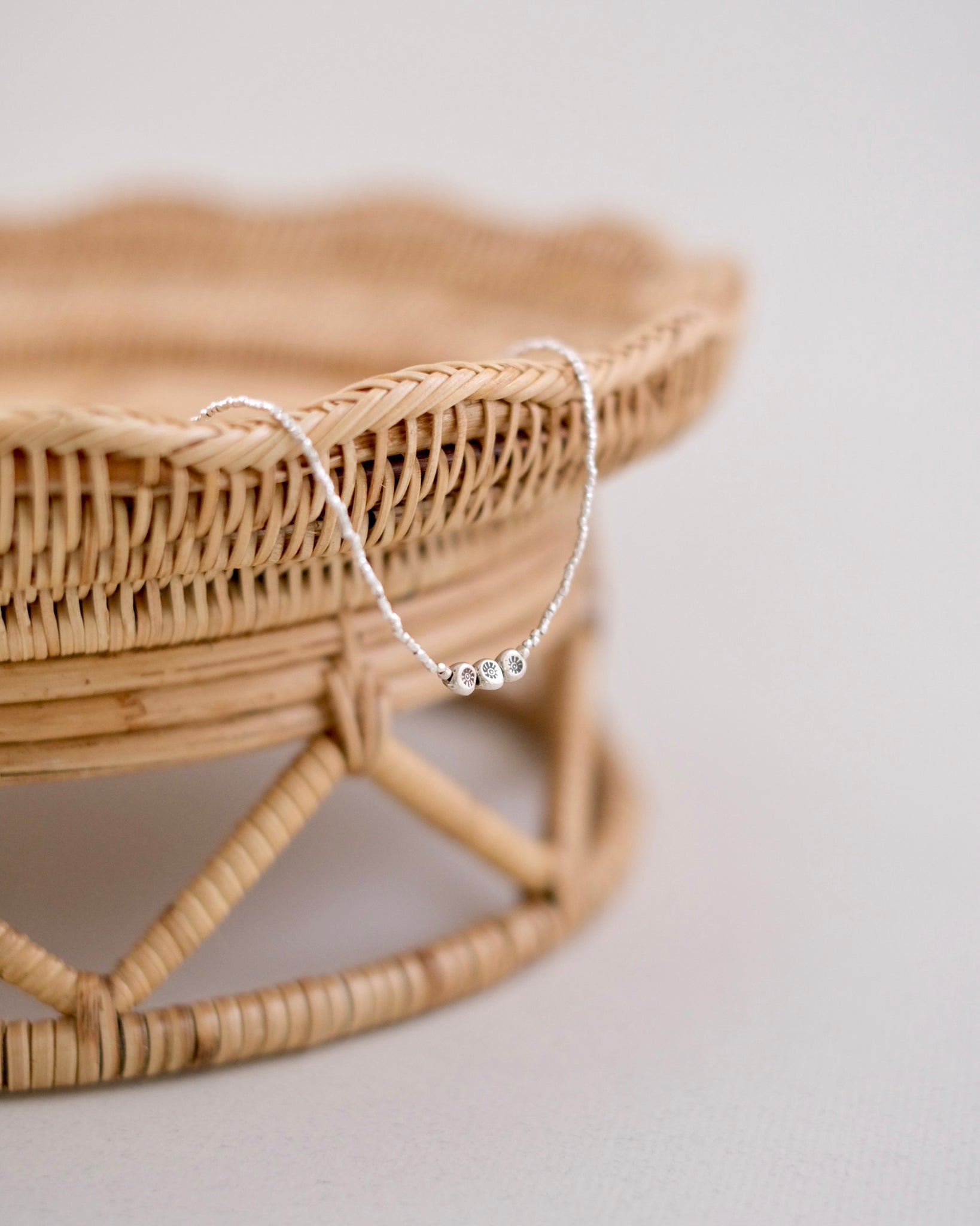1.2mm程の小さなシルバービーズにはカットが入っていて、小粒で繊細ながら、角度によってキラキラと輝きます。中心に並んだ刻印模様の三角形のシルバービーズがアクセントになったネックレスです。