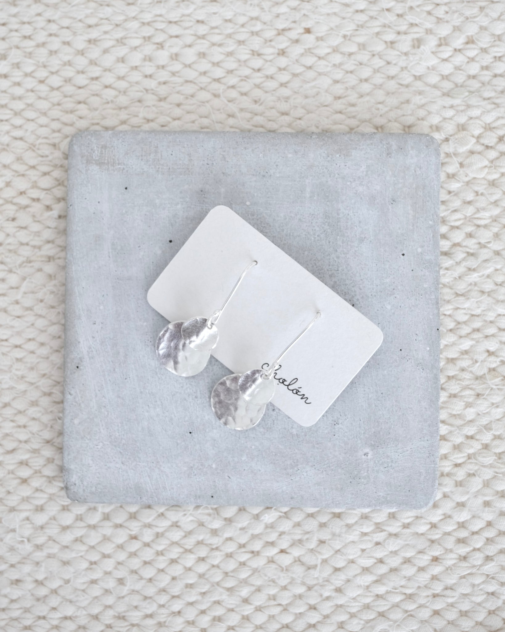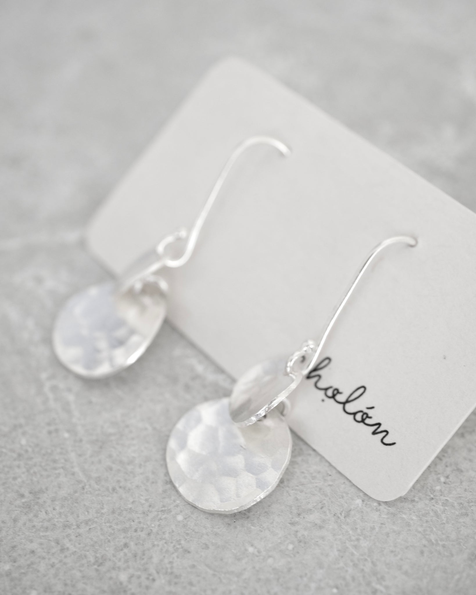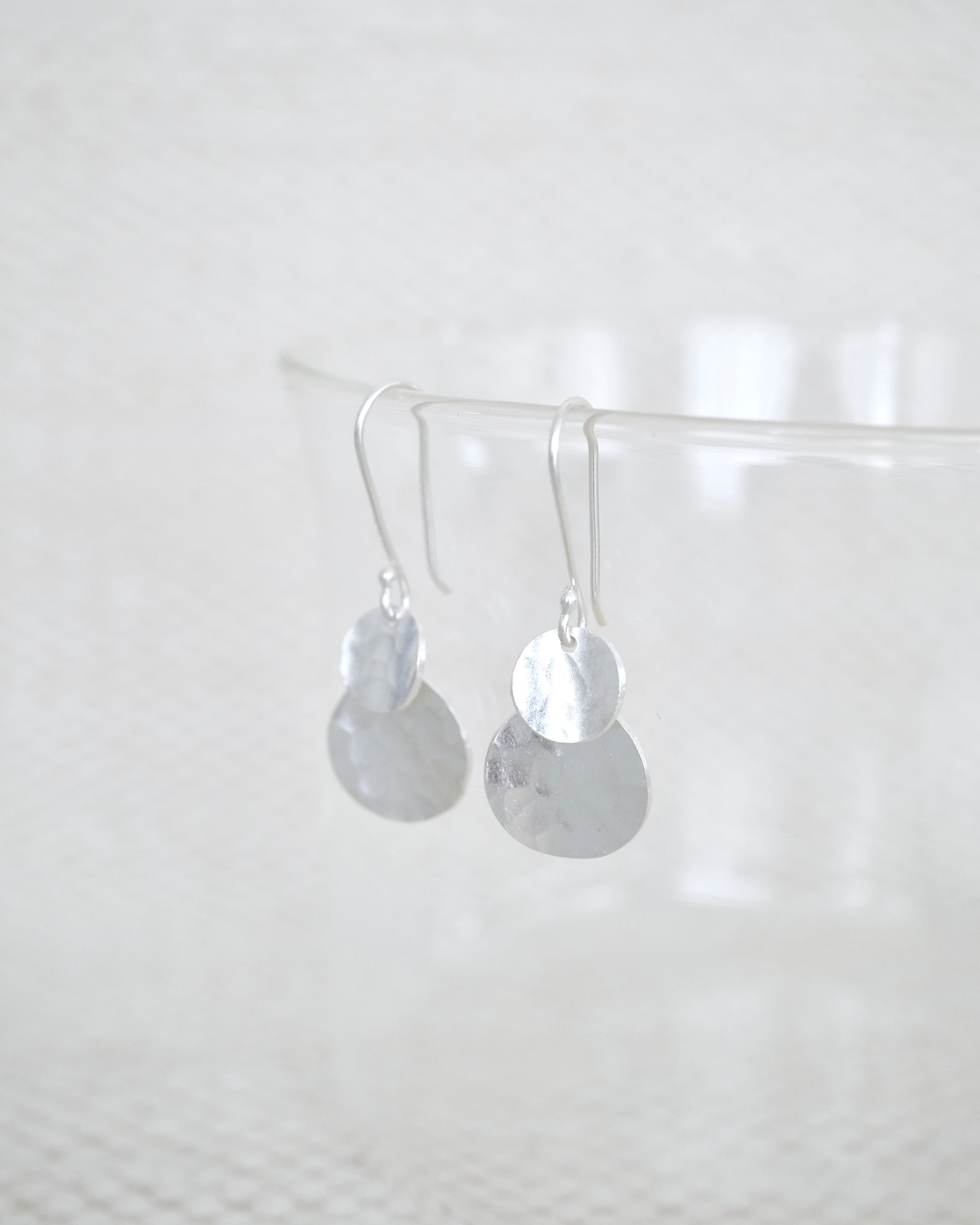 タイ北部の山岳民族カレン族が作る「カレンシルバー」のピアスです。「2連ラウンド」は大小2枚の円形プレートが重なり、耳元でやさしく揺れるデザインです。槌目(つちめ)仕上げで、ややマットな質感が温かみのある風合いです。