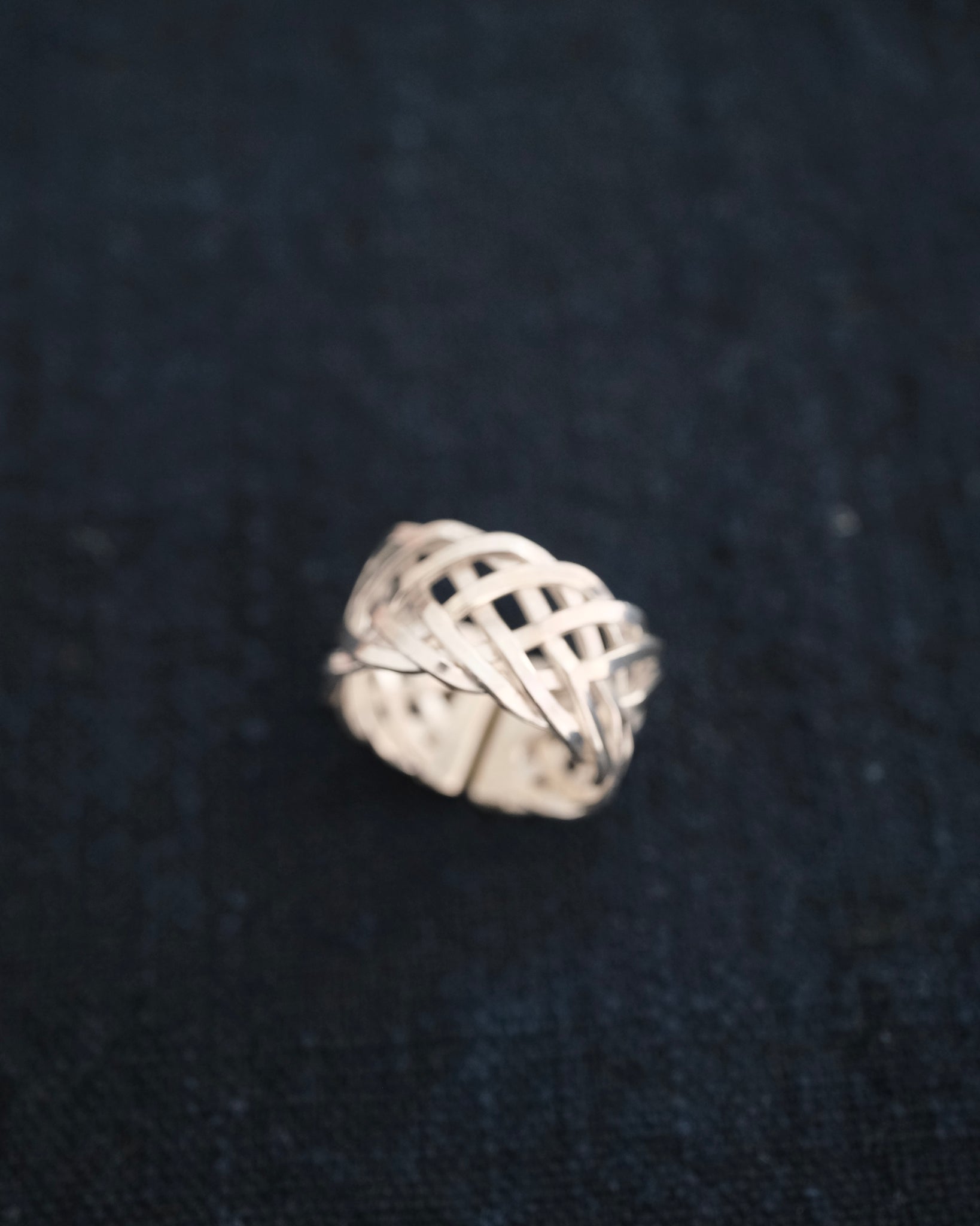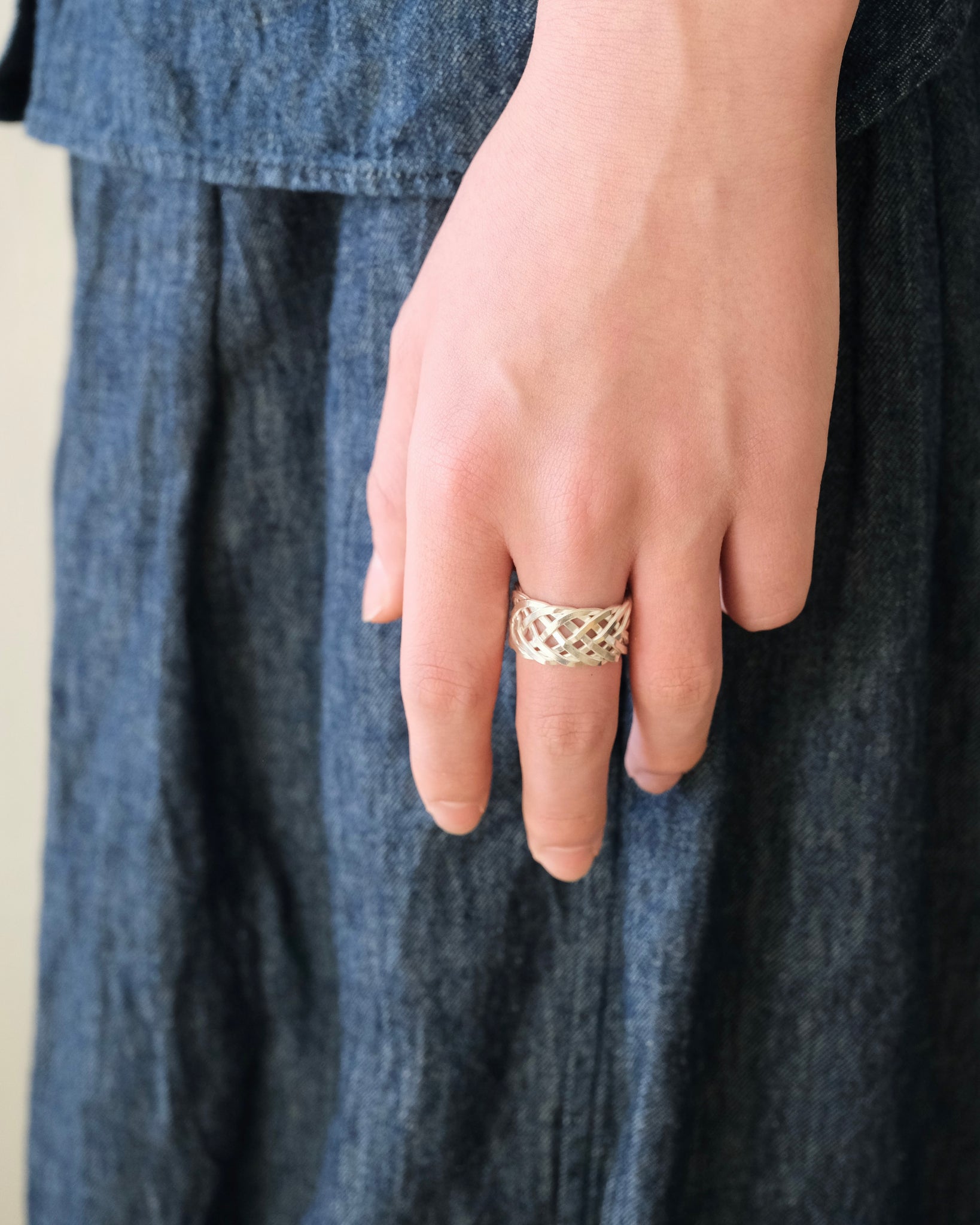 タイの山岳民族カレン族が伝統的な手法で作る「カレンシルバー」のアクセサリー。このリングはシルバーをかごのように編み込んだデザインが印象的です。透かし編みなので、幅広ですが重くなりすぎず、指に軽やかな印象を与えてくれます。多少サイズ調整が可能です。1箇所開いている部分がありますので、やさしく開いてサイズを合わせてご使用ください。