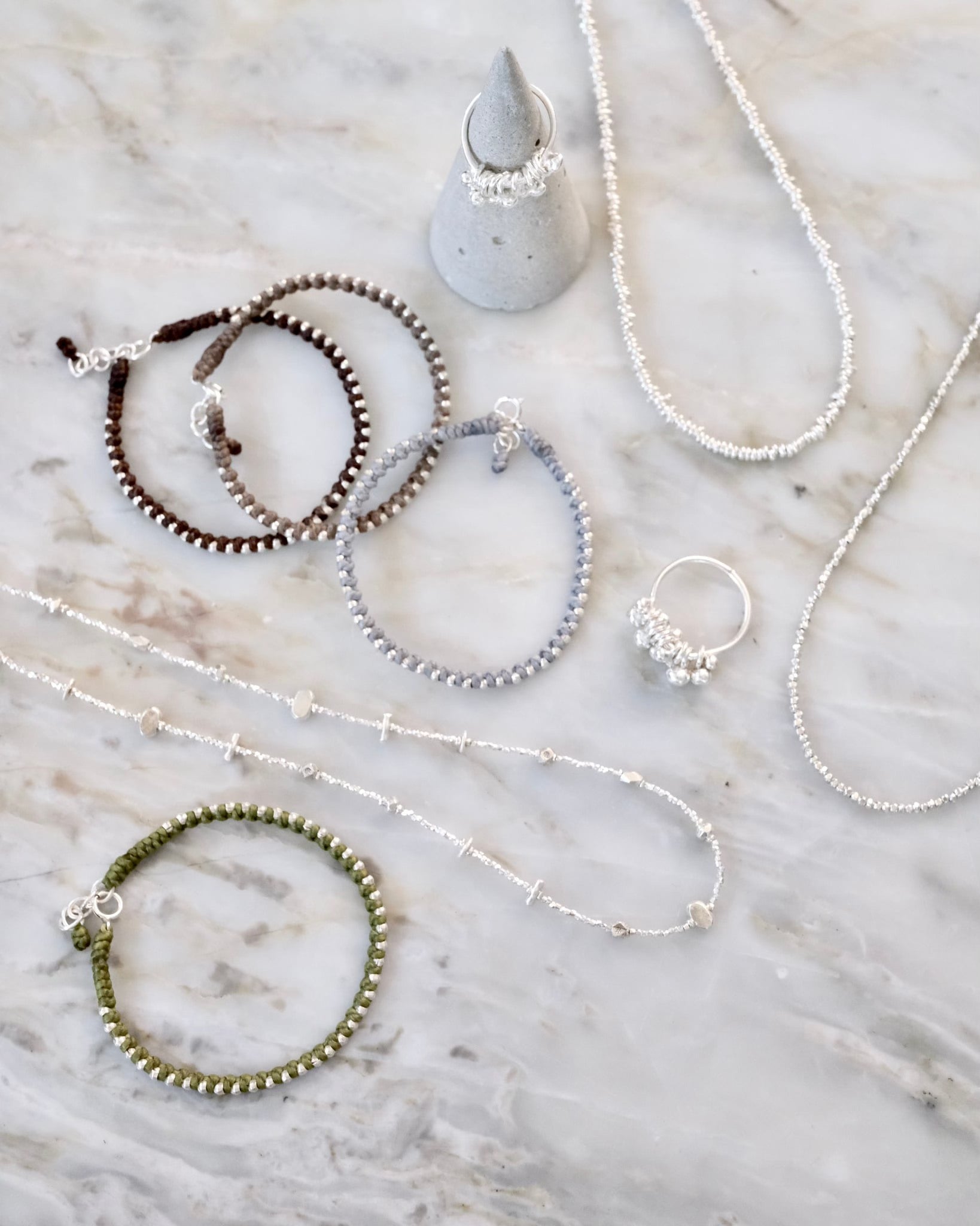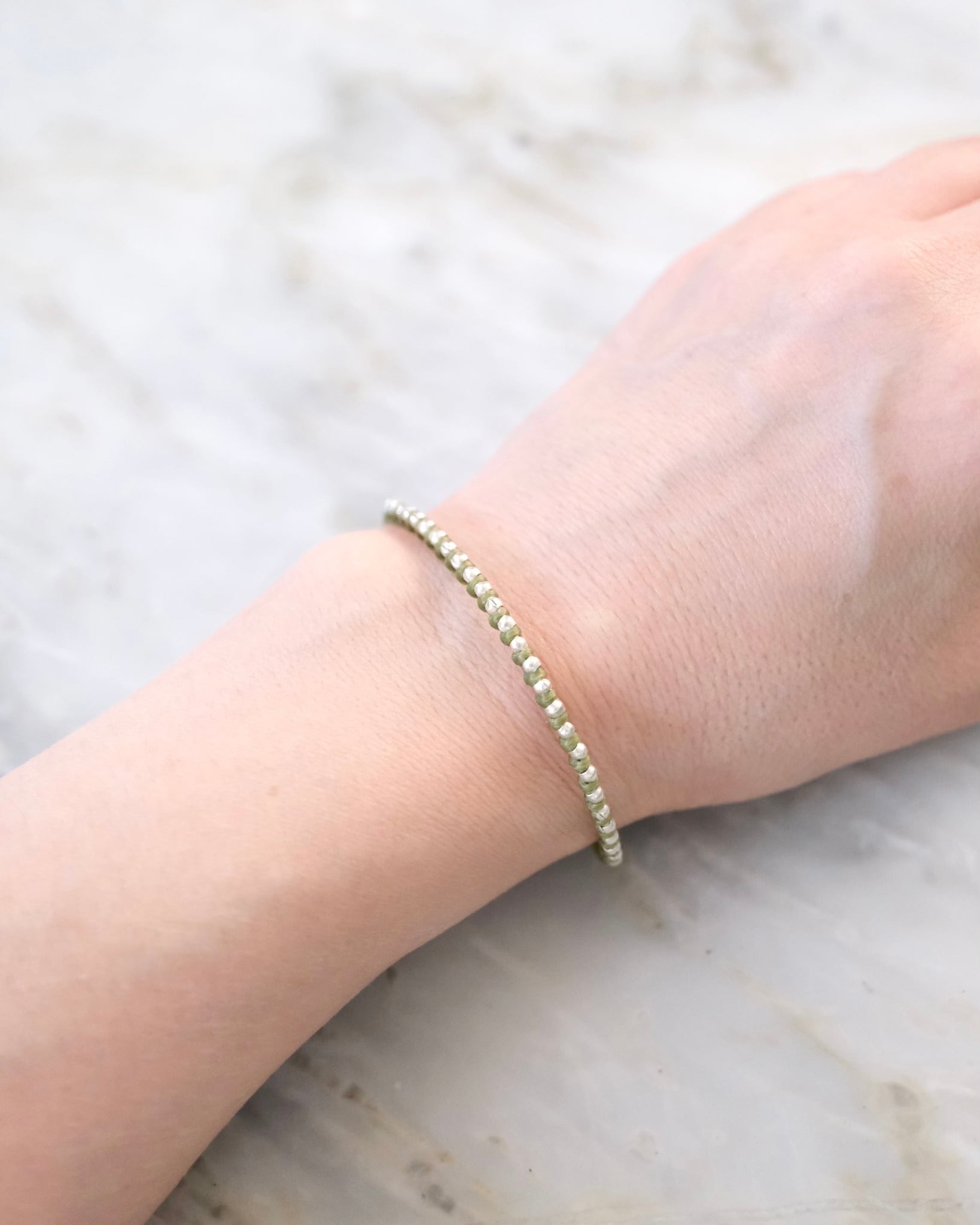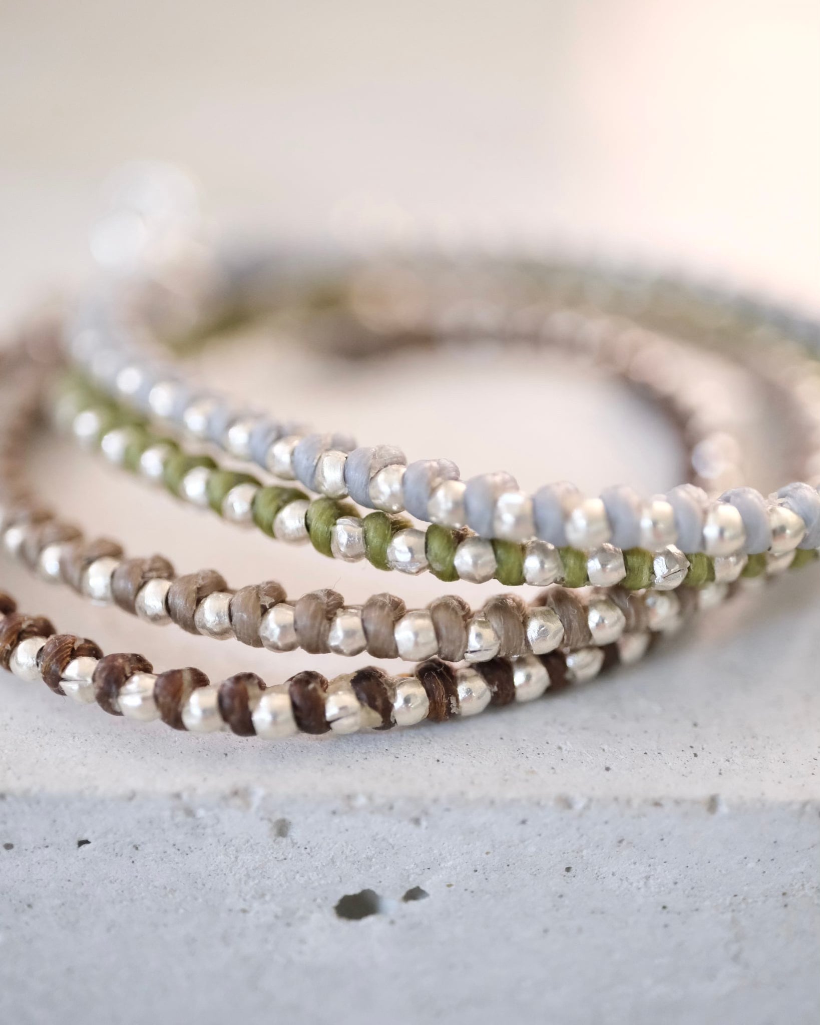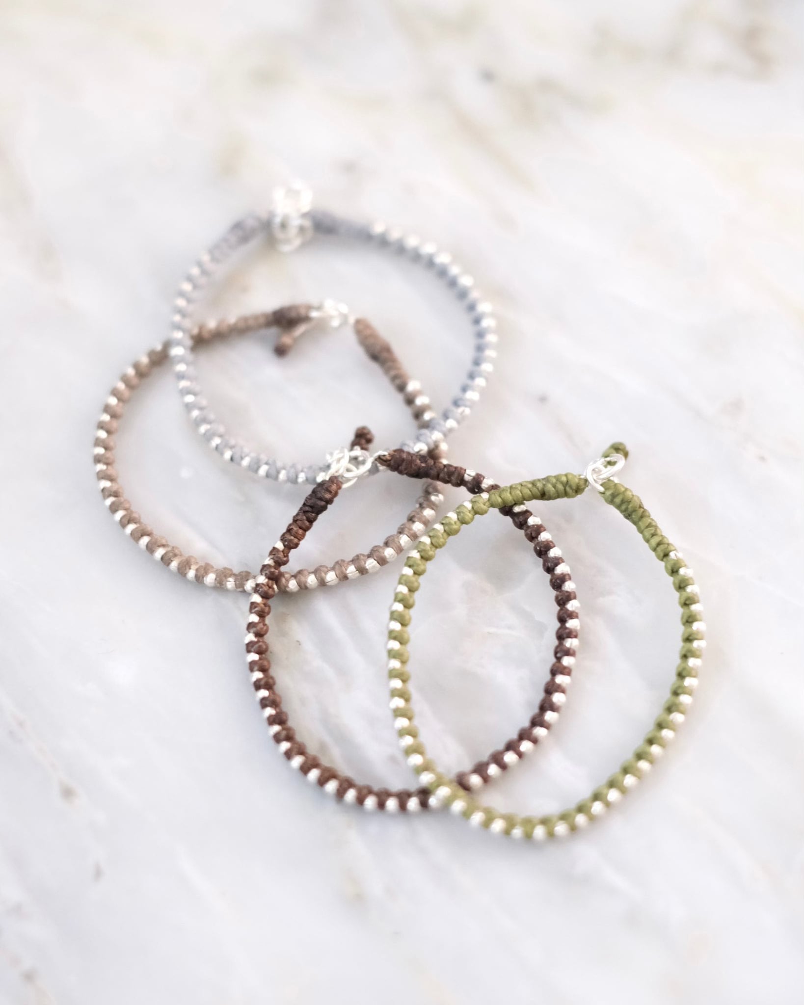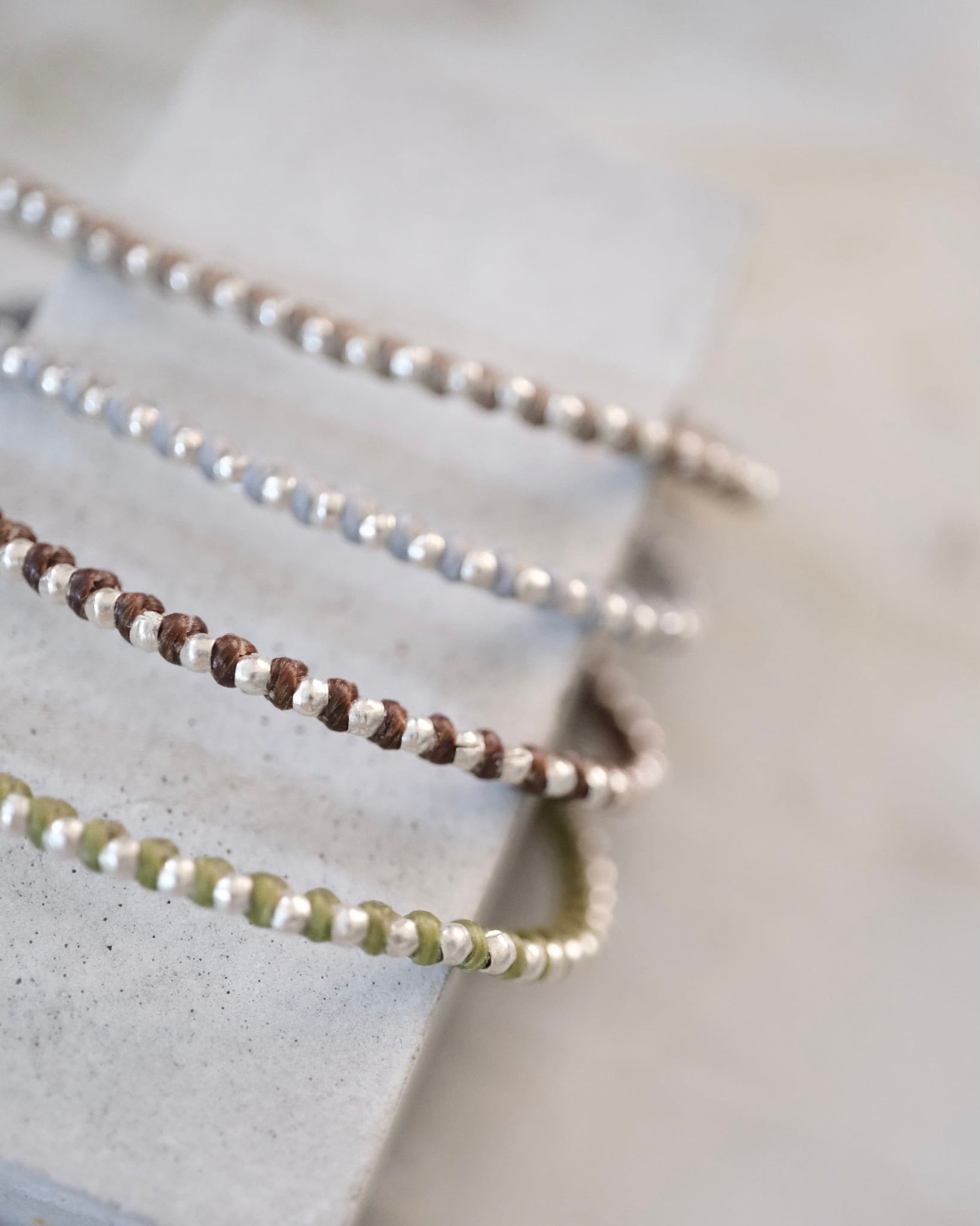 繊細なカレンシルバーのビーズを、素朴なワックスコードに編み込んだ、シンプルなデザインのブレスレットです。アジャスター付きで長さが調節できます。