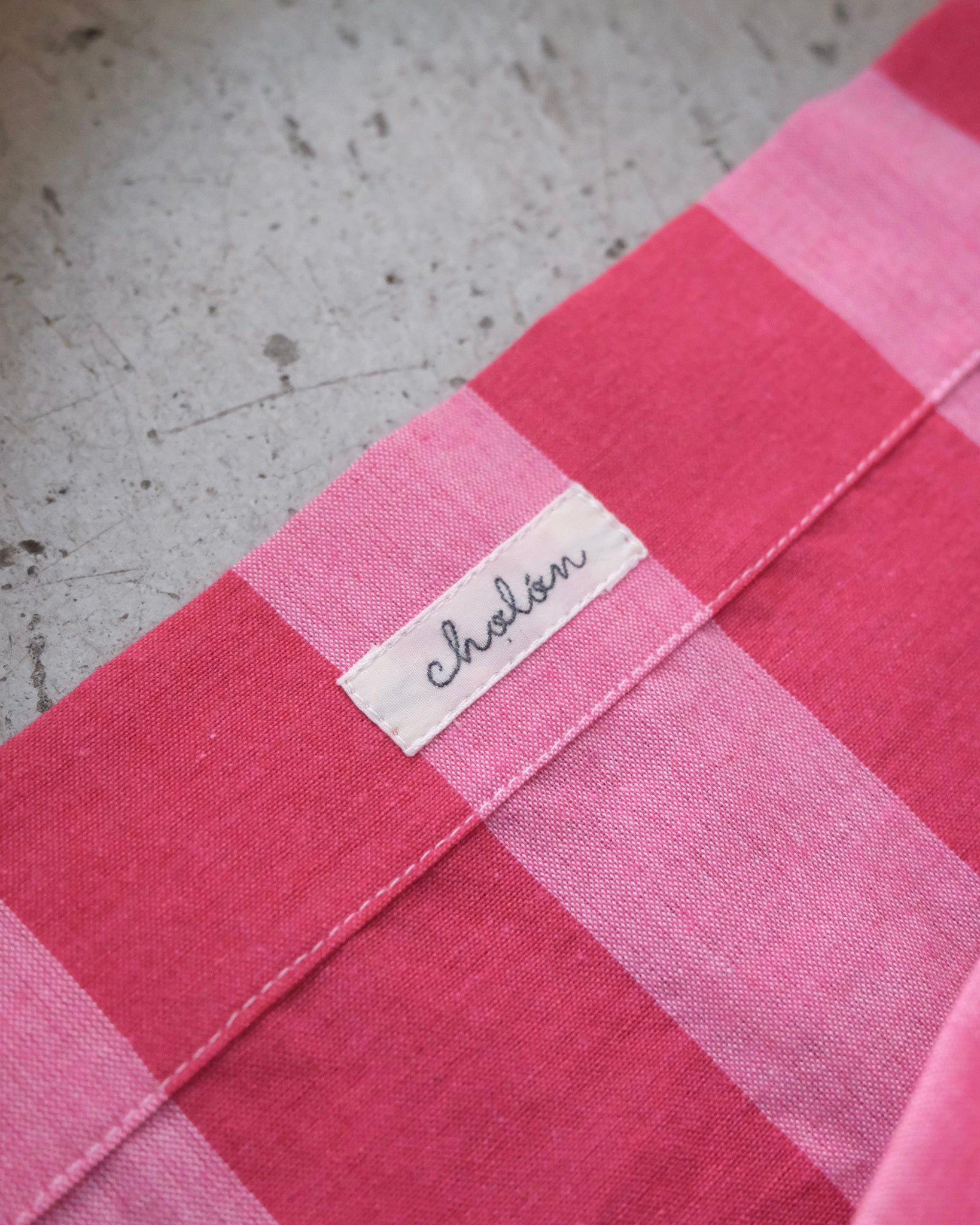 肩にかけて使うワンショルダータイプで、持ち手は5cm幅の生成りの綾織りテープを使っています。内側にcholonのネーム付き。軽く、たっぷりサイズなので畳んでエコバッグとして持ち歩きするのにもおすすめです。