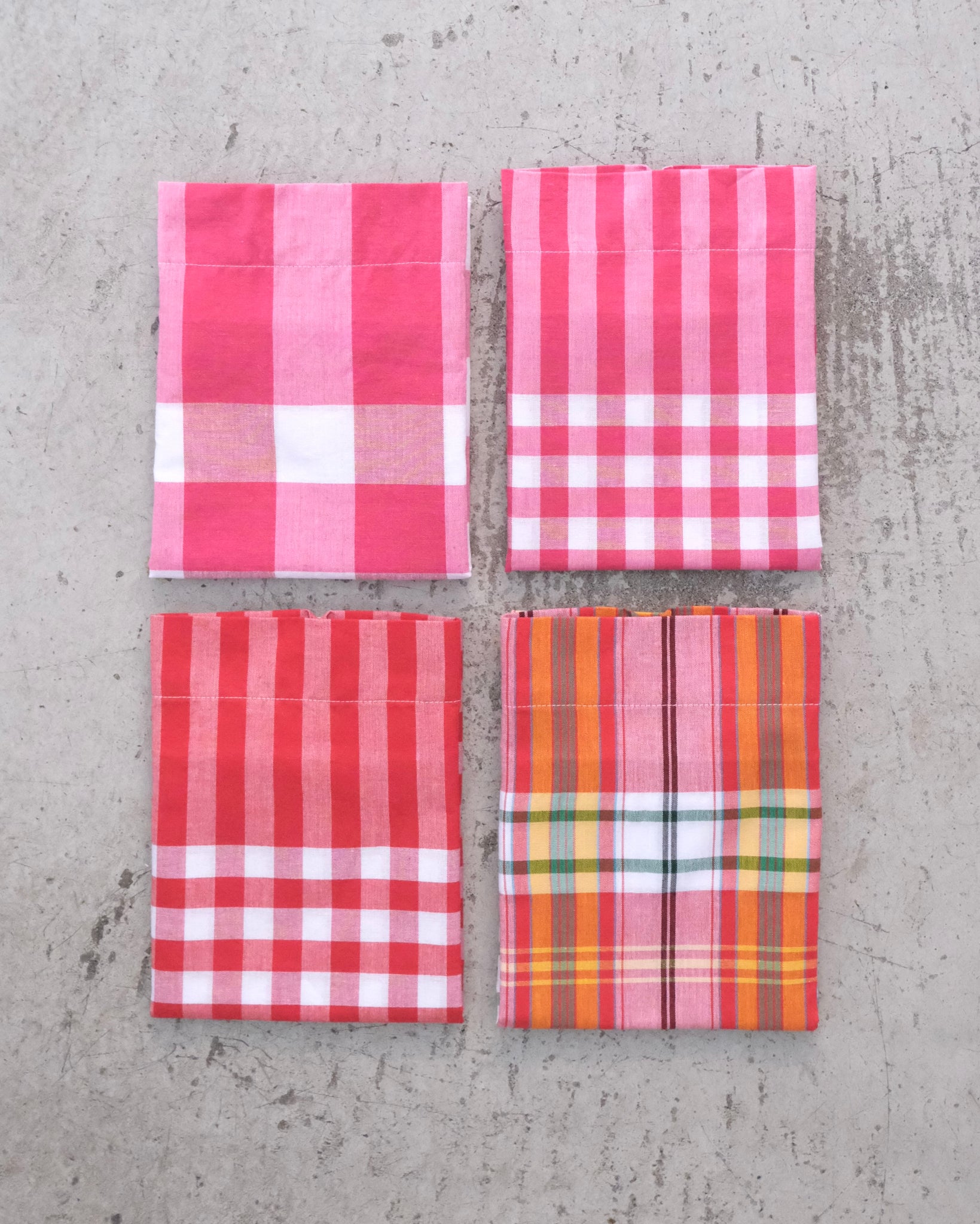 タイの市場でたくさんの柄の中からセレクトした布を、バッグに仕立てました。1種類の柄を使ったものと、パッチワークのタイプがあります。パッチワークのタイプは4種類のチェックを使っていて両面それぞれ柄の出方が違います。