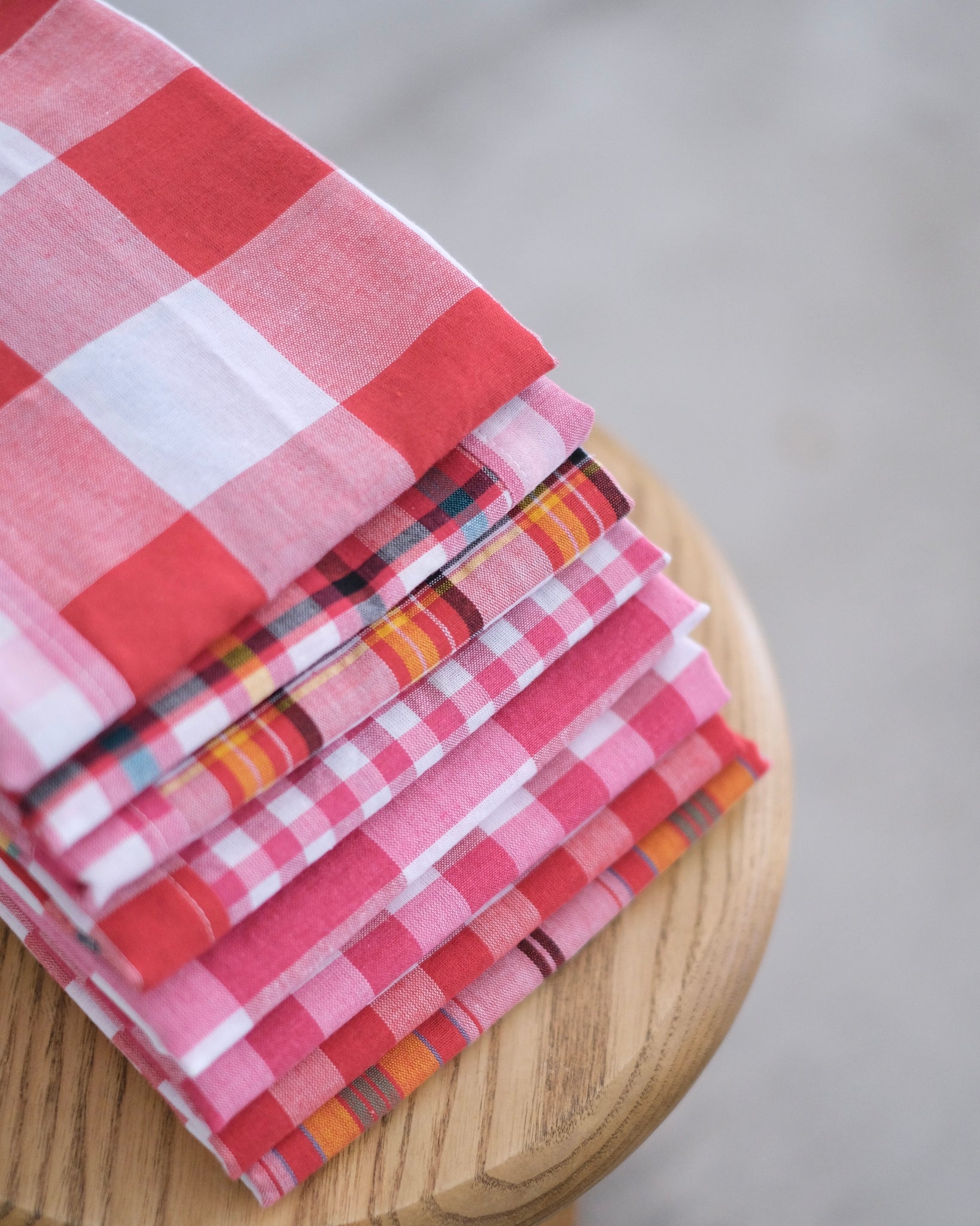 パーカオマーは、タイで昔から使われているチェック柄のストール状の布のこと。ギンガムチェックやマドラスチェック風など柄のバリエーションがたくさんあります。布のサイズは80cm×180cmほどで、両端30cmくらいだけチェックではなくストライプ柄になっているのが特徴です。