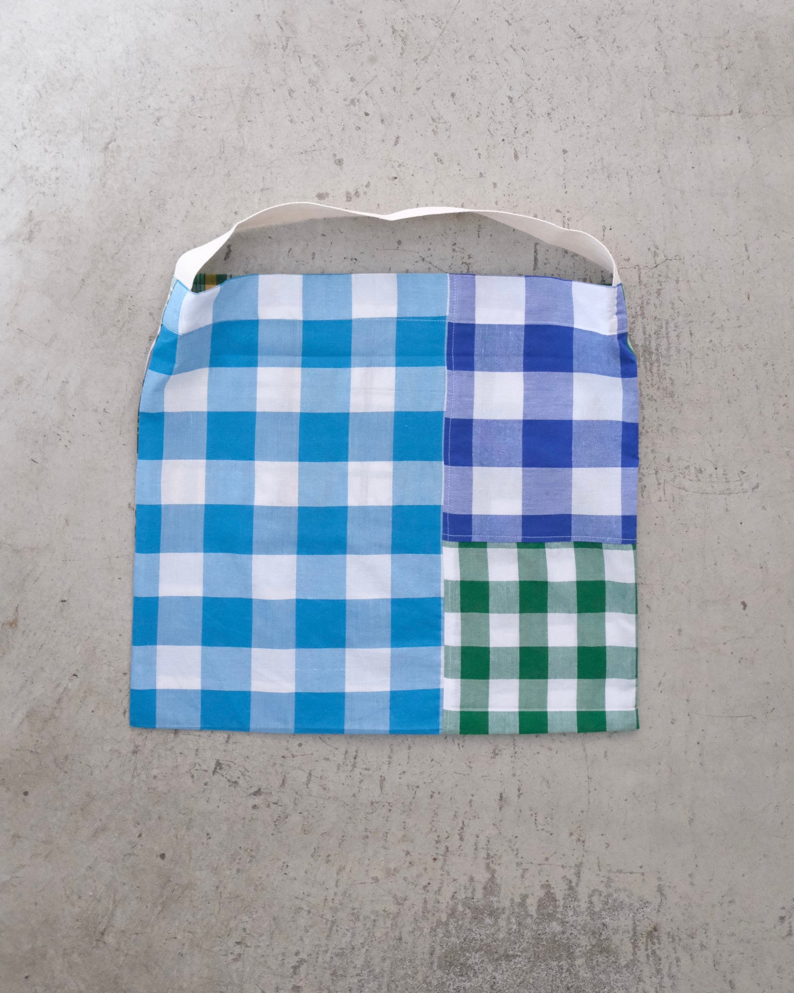 タイの市場でたくさんの柄の中からセレクトした布を、バッグに仕立てました。1種類の柄を使ったものと、パッチワークのタイプがあります。パッチワークのタイプは4種類のチェックを使っていて両面それぞれ柄の出方が違います。