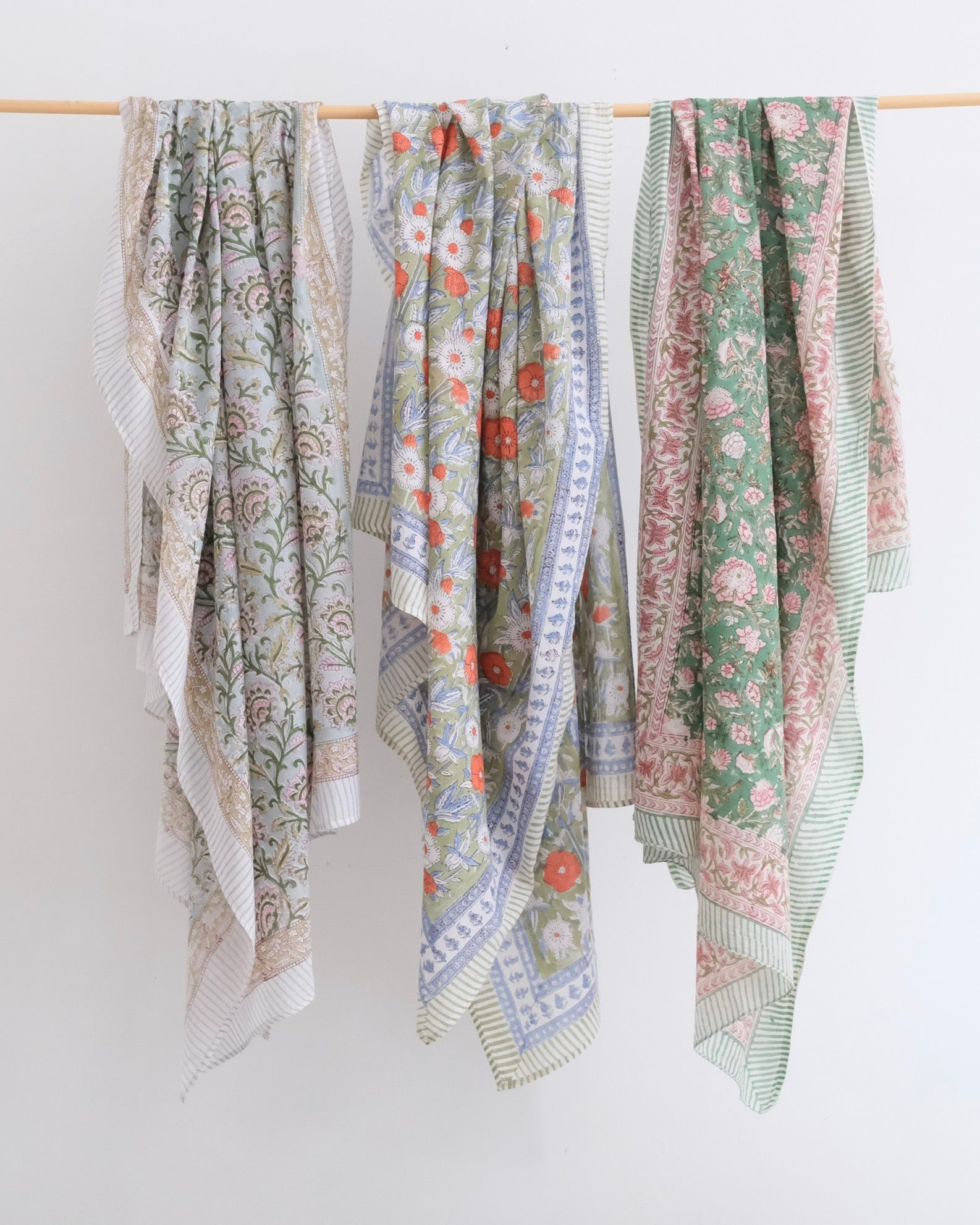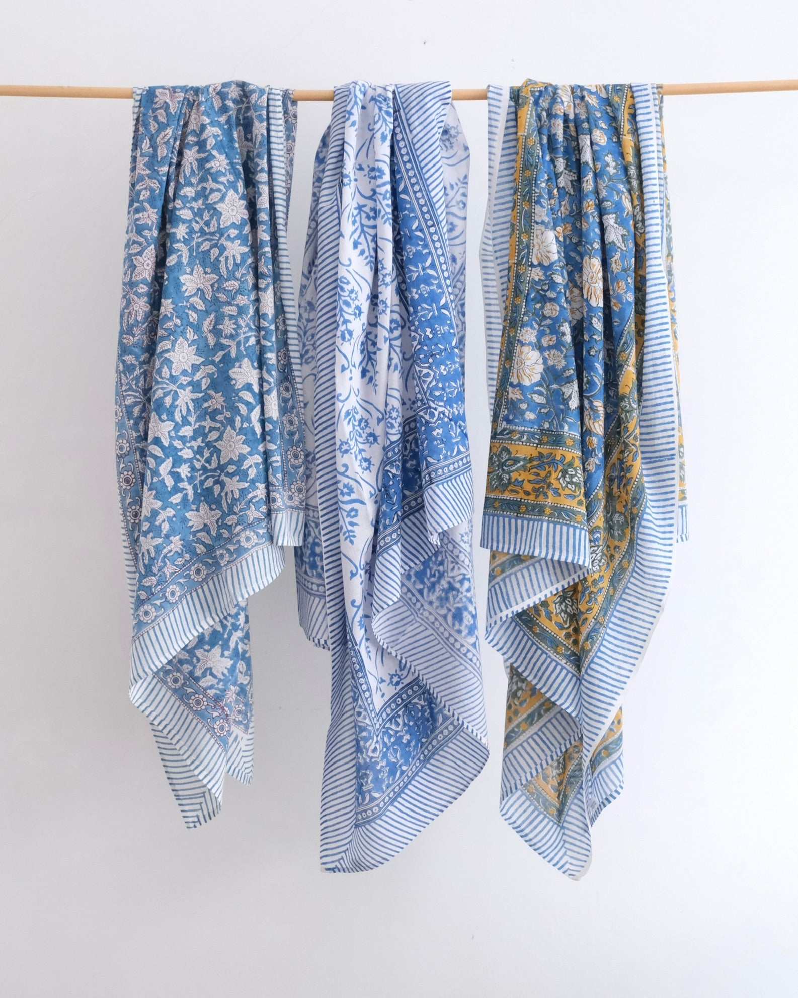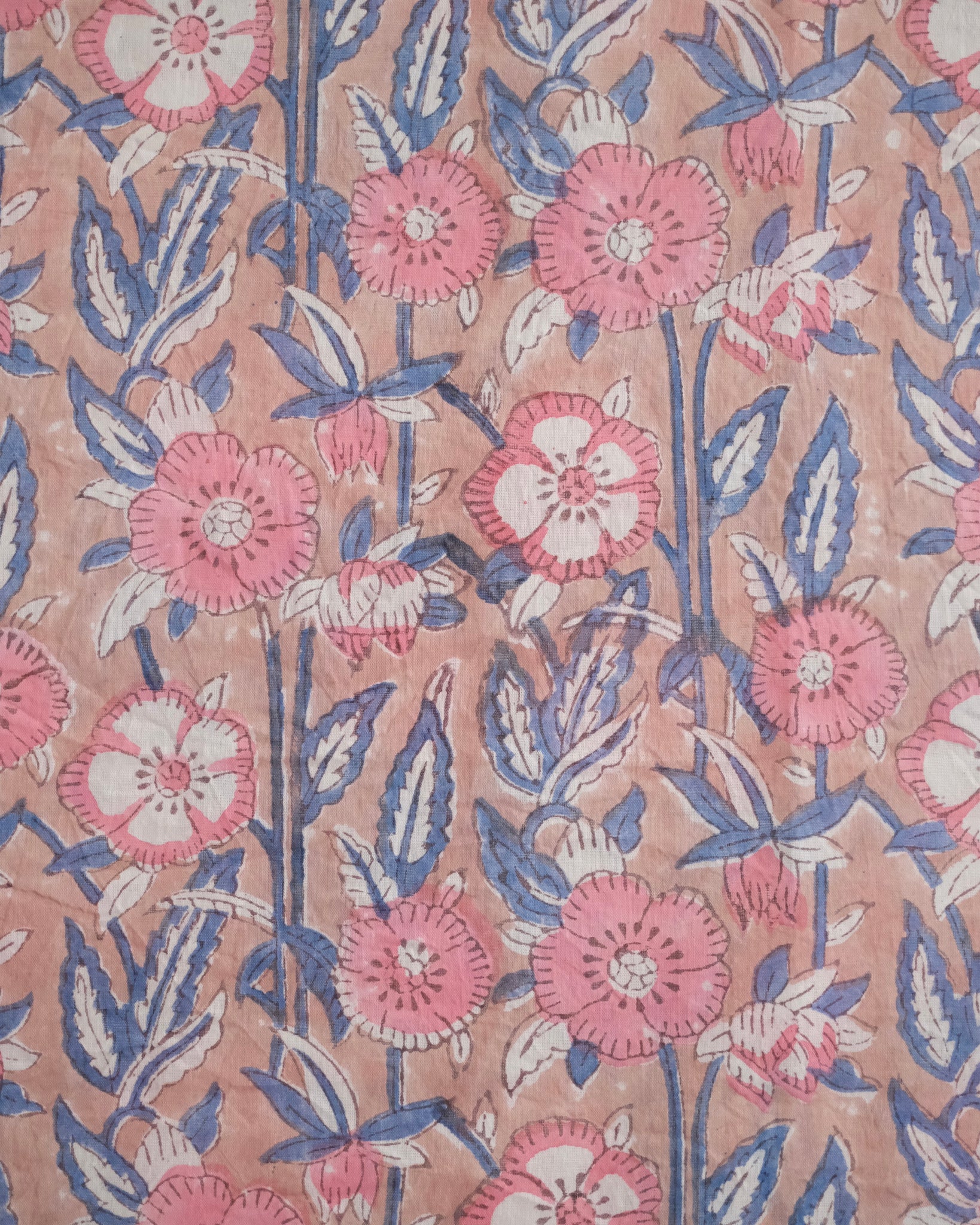 ブロックプリントは、インドで古くから伝わる染めの技法で、手彫りの木製の版木を生地に直接押して模様をプリントしていきます。手作業で行うため、わずかに版がずれていたり色のかすれが見られたりするのもブロックプリントならではの味わいに。素朴さが美しく、手仕事の温かさを感じることができる布です。