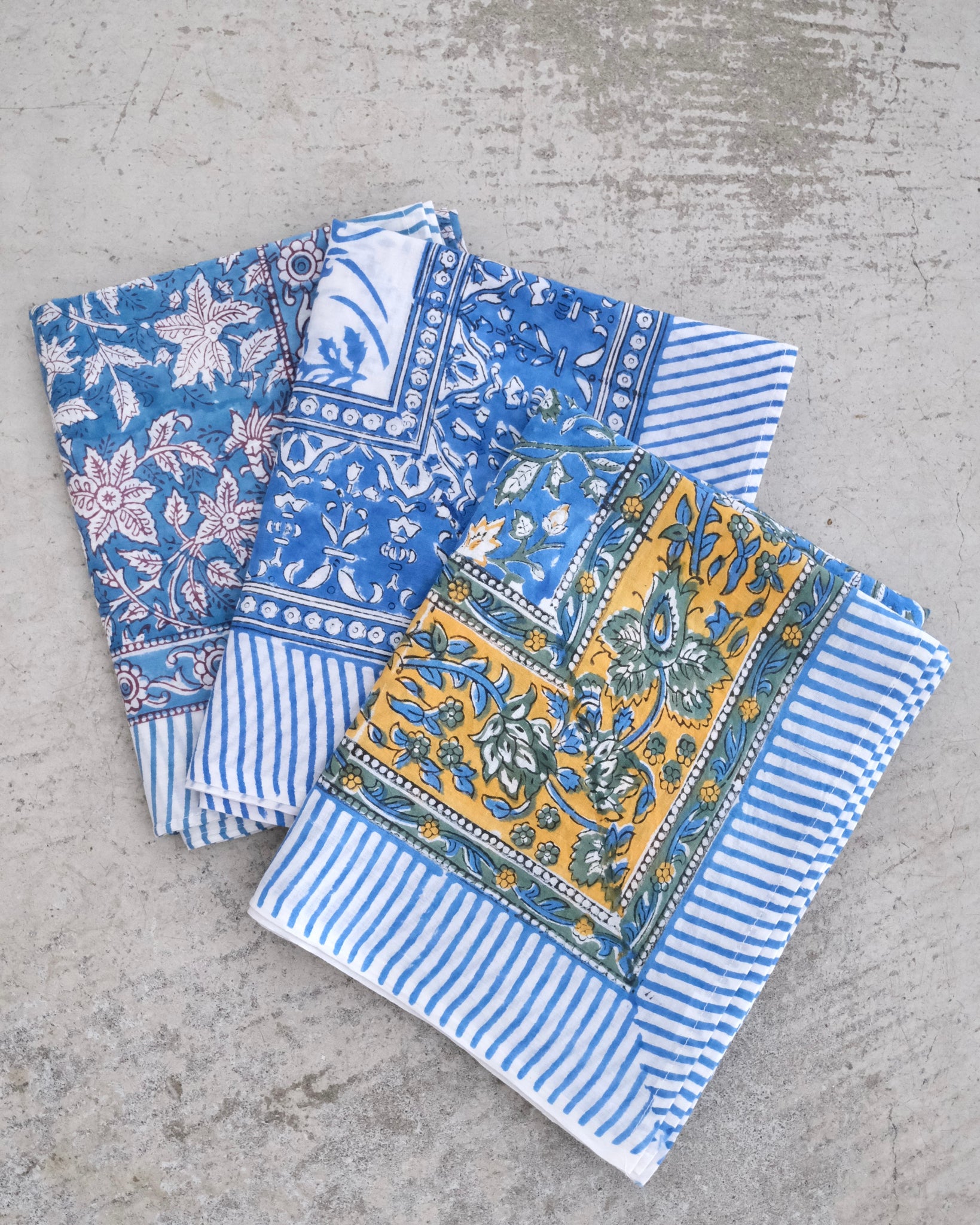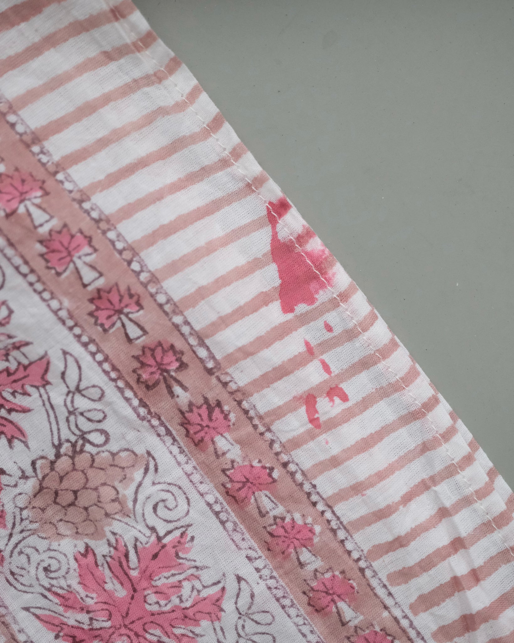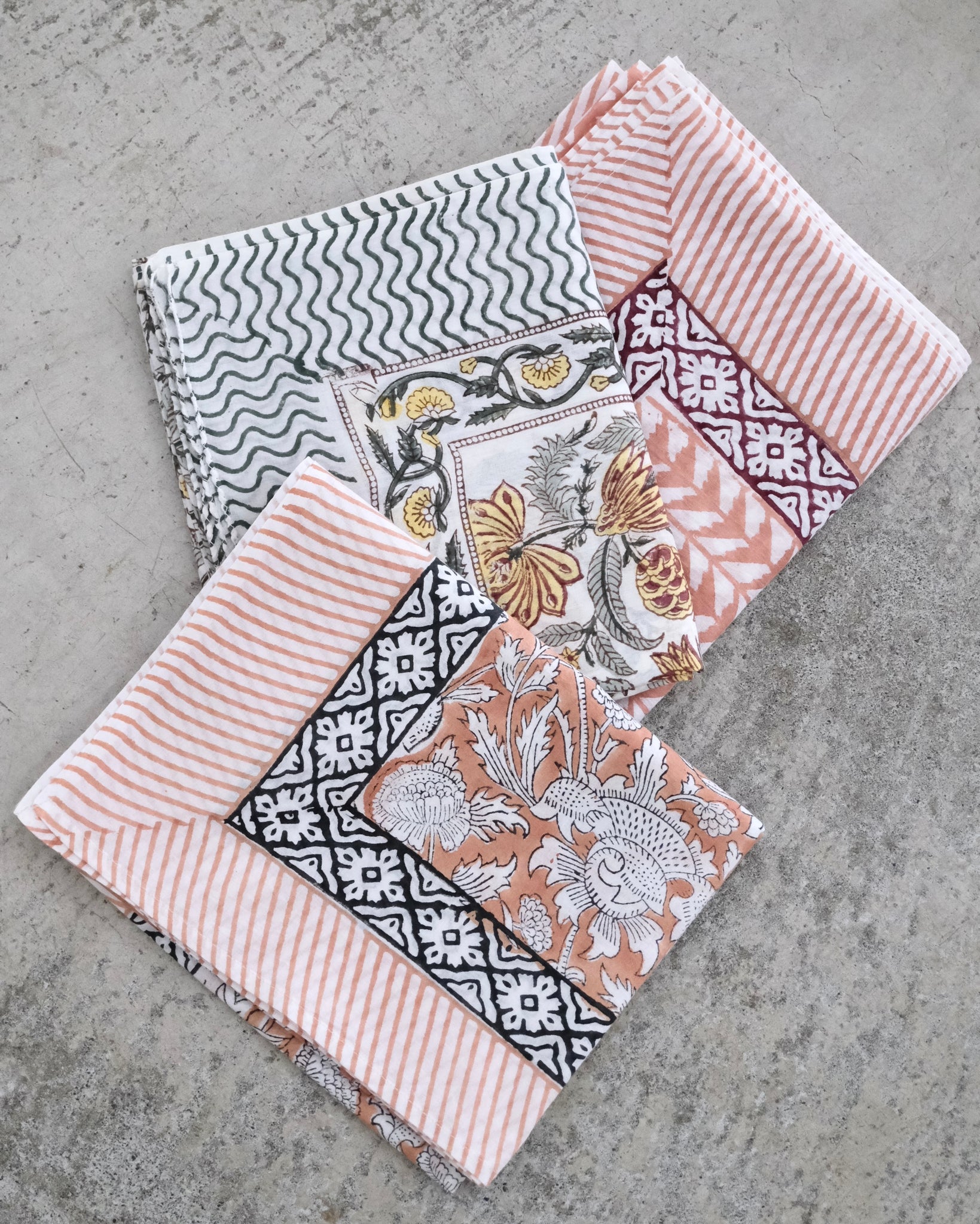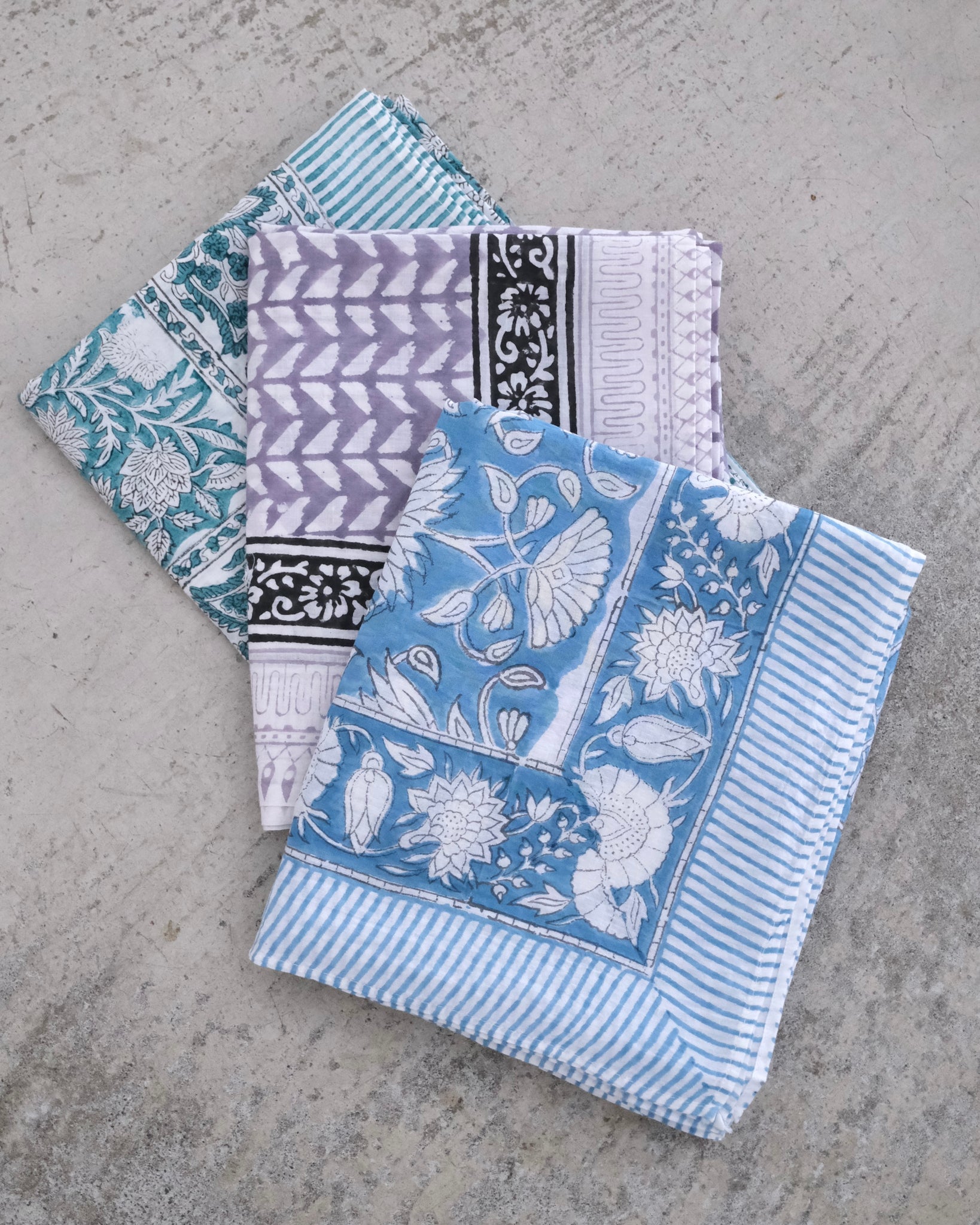 ブロックプリントは、インドで古くから伝わる染めの技法で、手彫りの木製の版木を生地に直接押して模様をプリントしていきます。手作業で行うため、わずかに版がずれていたり色のかすれが見られたりするのもブロックプリントならではの味わいに。素朴さが美しく、手仕事の温かさを感じることができる布です。