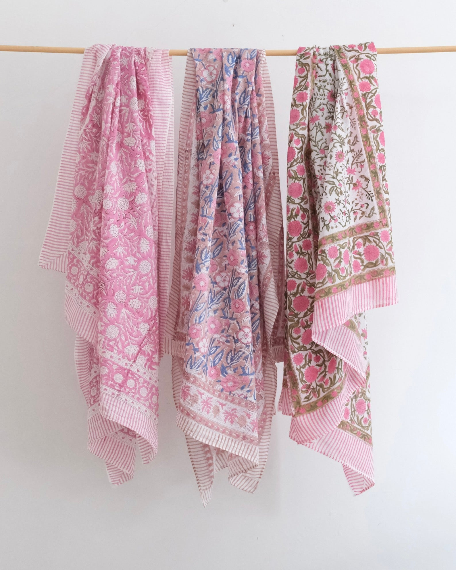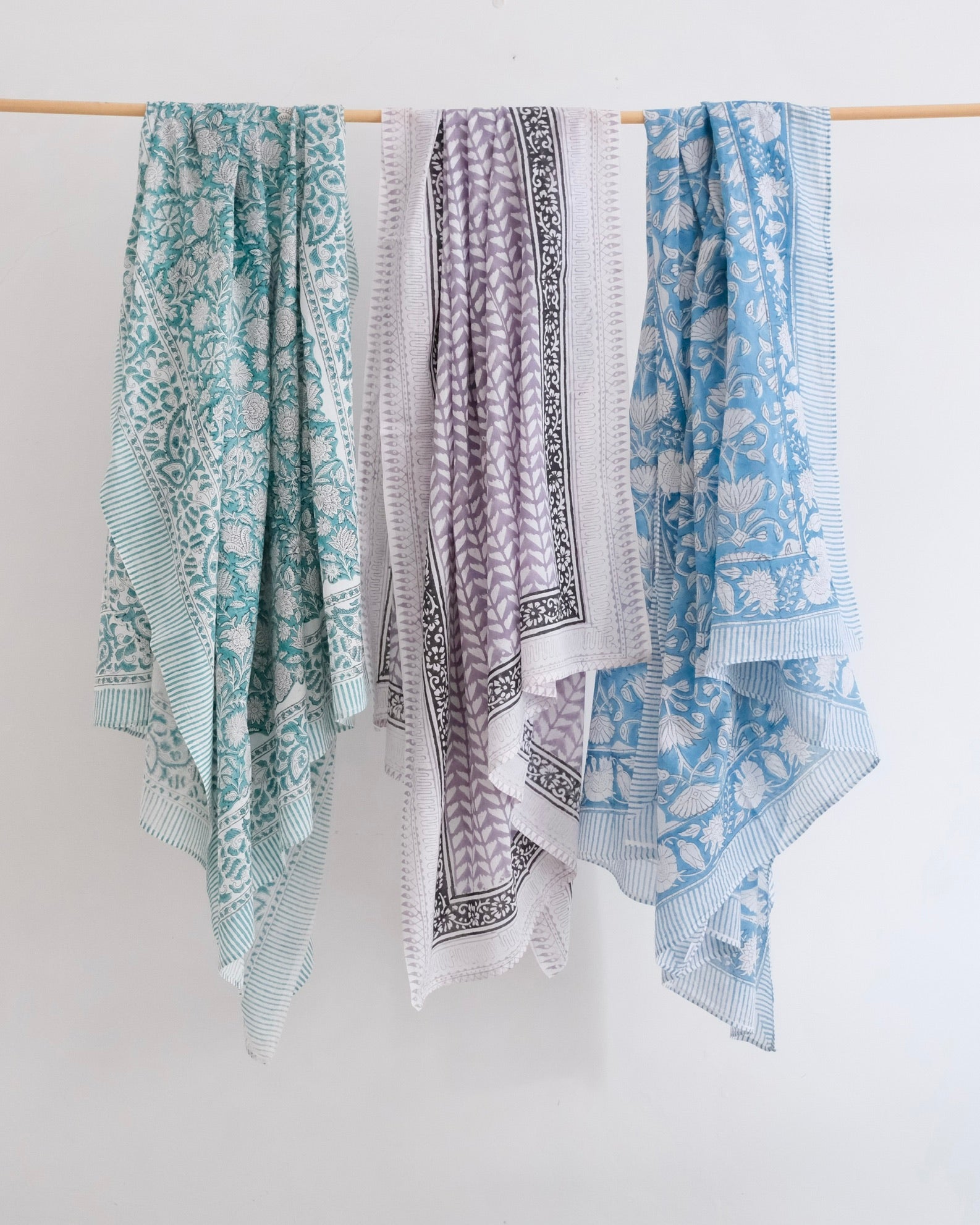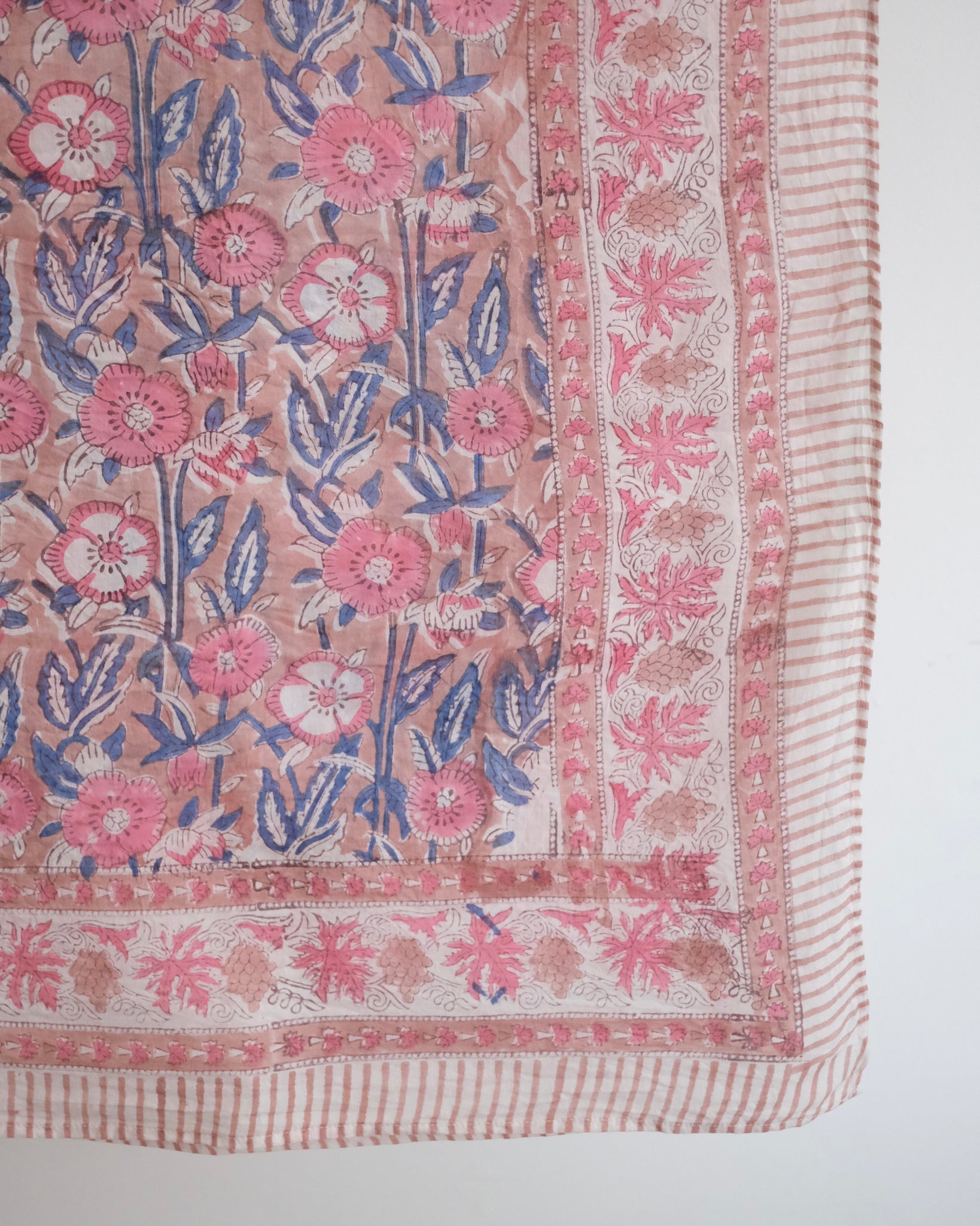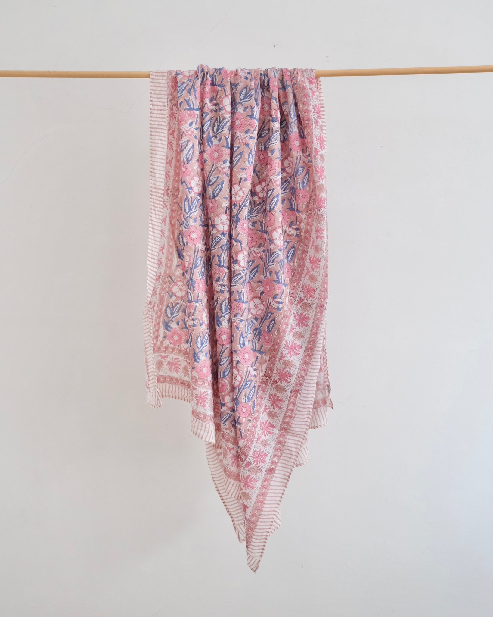 インドの伝統的な花柄のブロックプリントが美しい大判のストール。薄手のコットンでさらりとした肌触りです。とても軽いので持ち歩きにも便利なストールです。(こちらの柄はふちに染めムラがあります。写真6枚目)