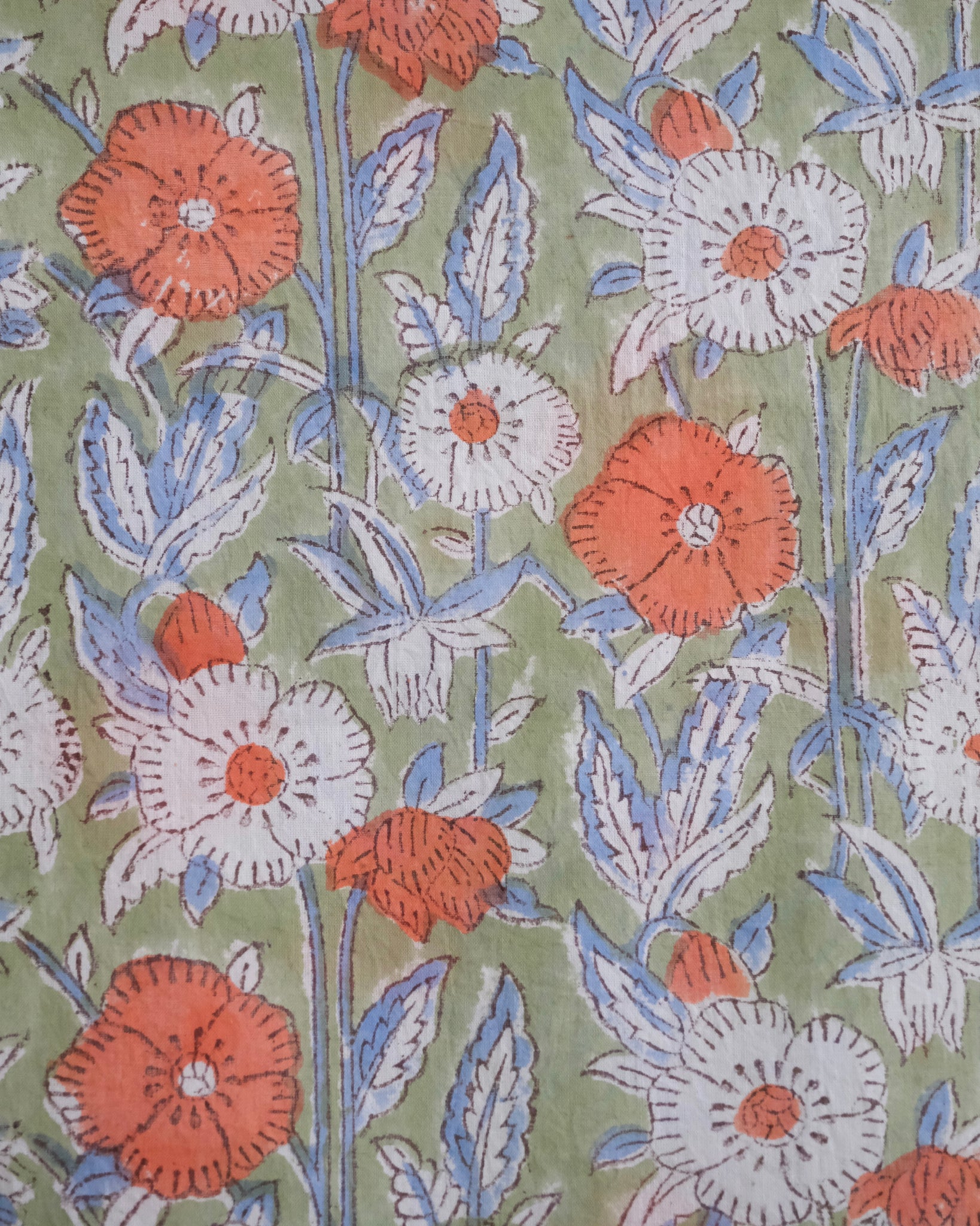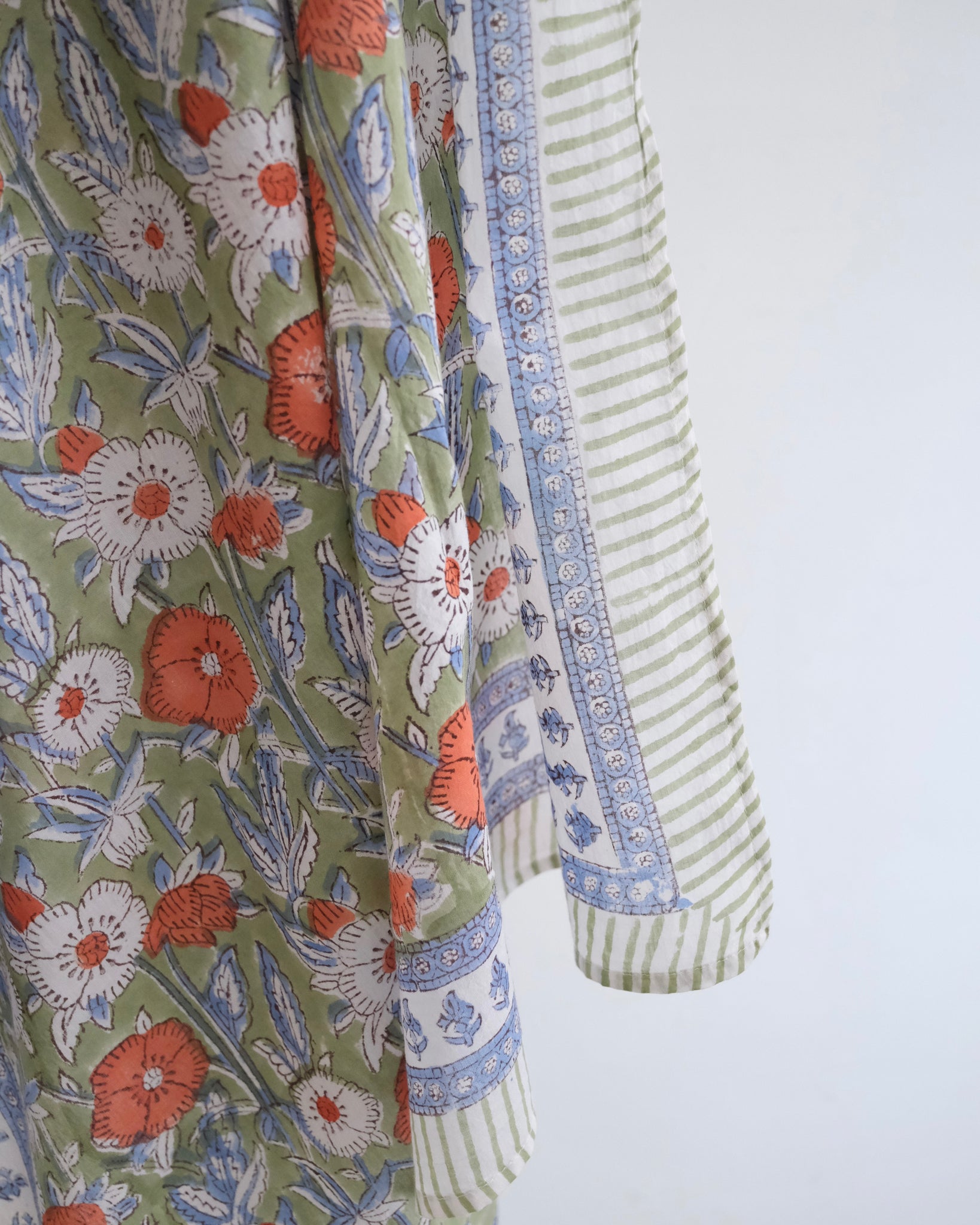 ブロックプリントは、インドで古くから伝わる染めの技法で、手彫りの木製の版木を生地に直接押して模様をプリントしていきます。手作業で行うため、わずかに版がずれていたり色のかすれが見られたりするのもブロックプリントならではの味わいに。素朴さが美しく、手仕事の温かさを感じることができる布です。