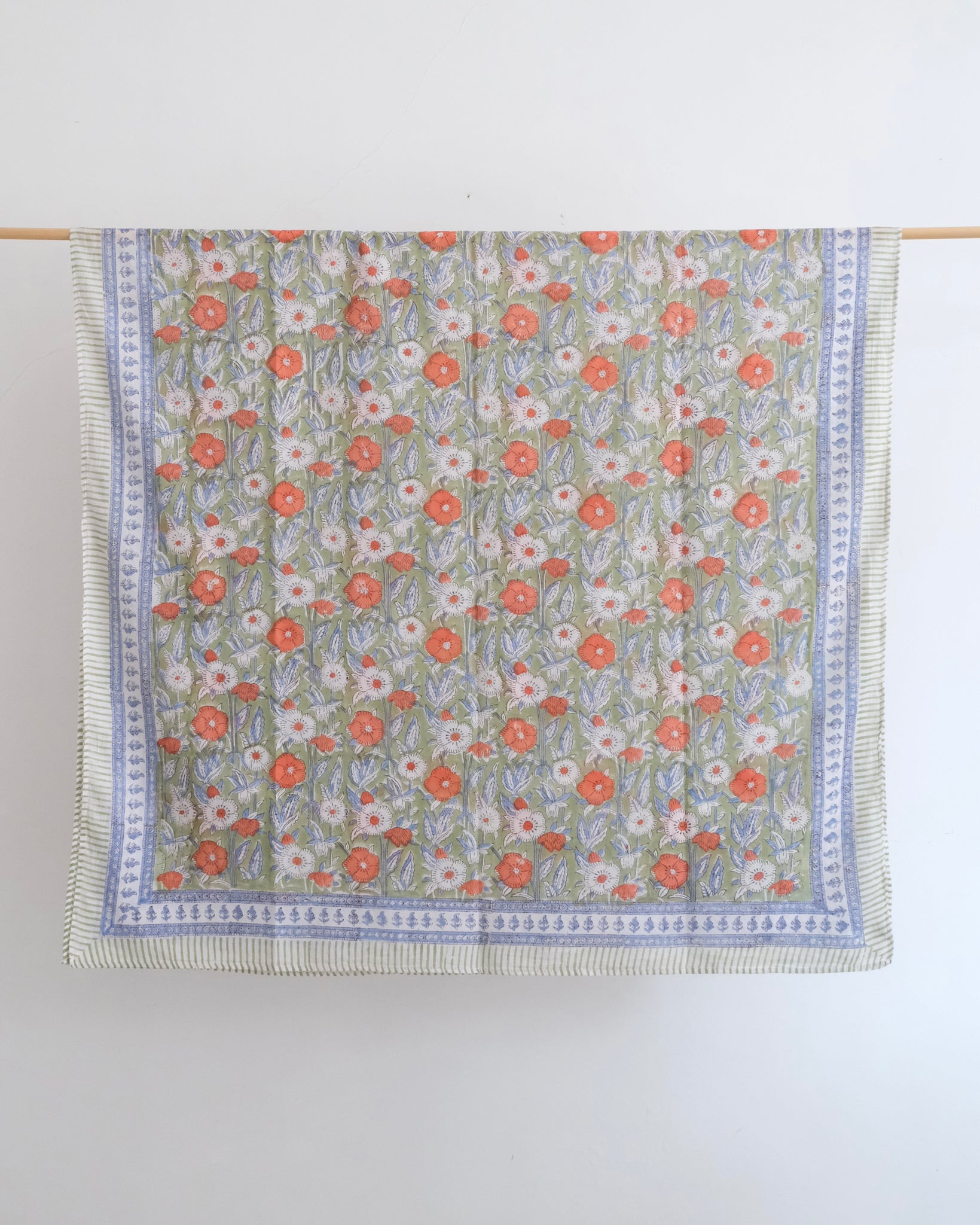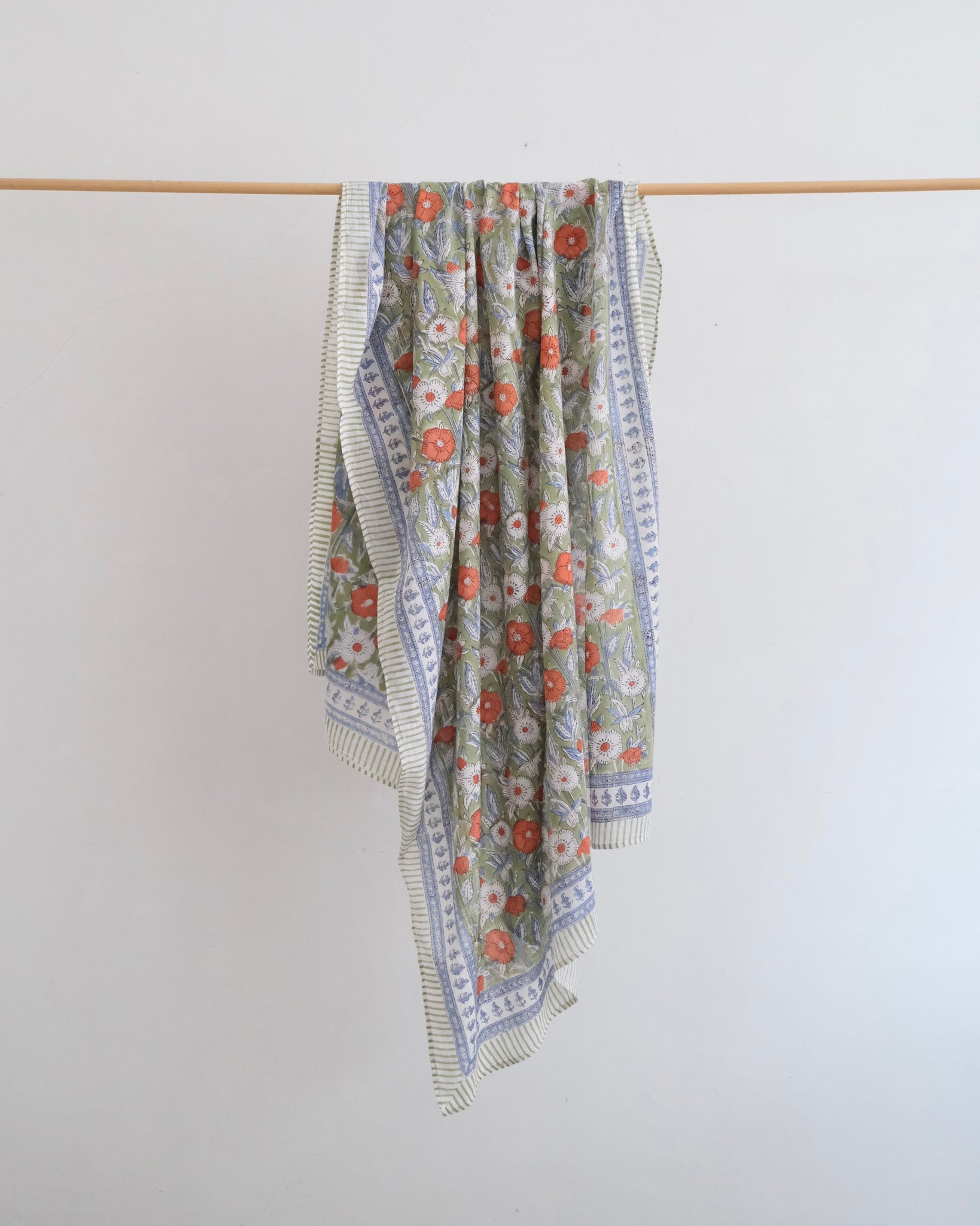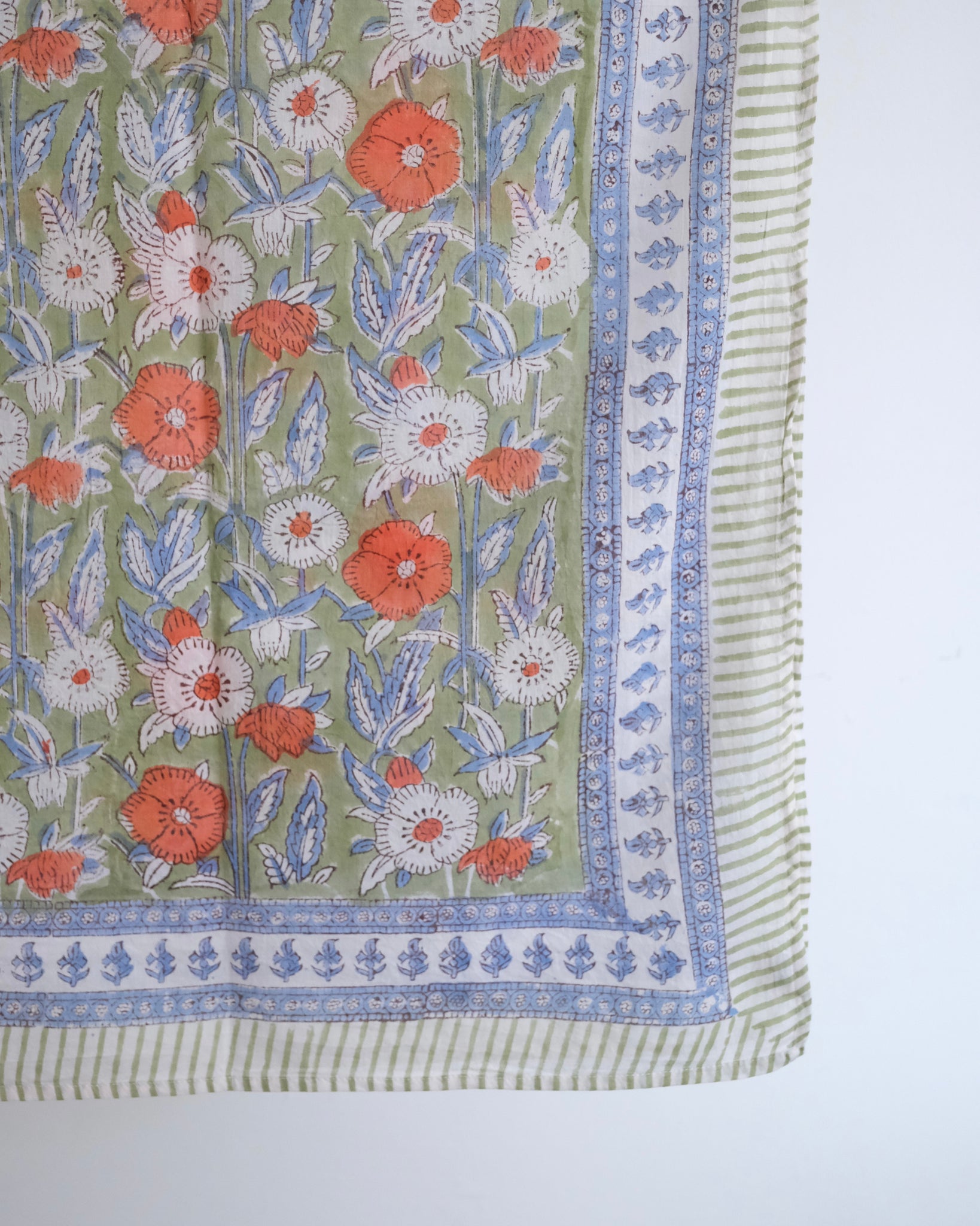 インドの伝統的な花柄のブロックプリントが美しい大判のストール。薄手のコットンでさらりとした肌触りです。とても軽いので持ち歩きにも便利なストールです。