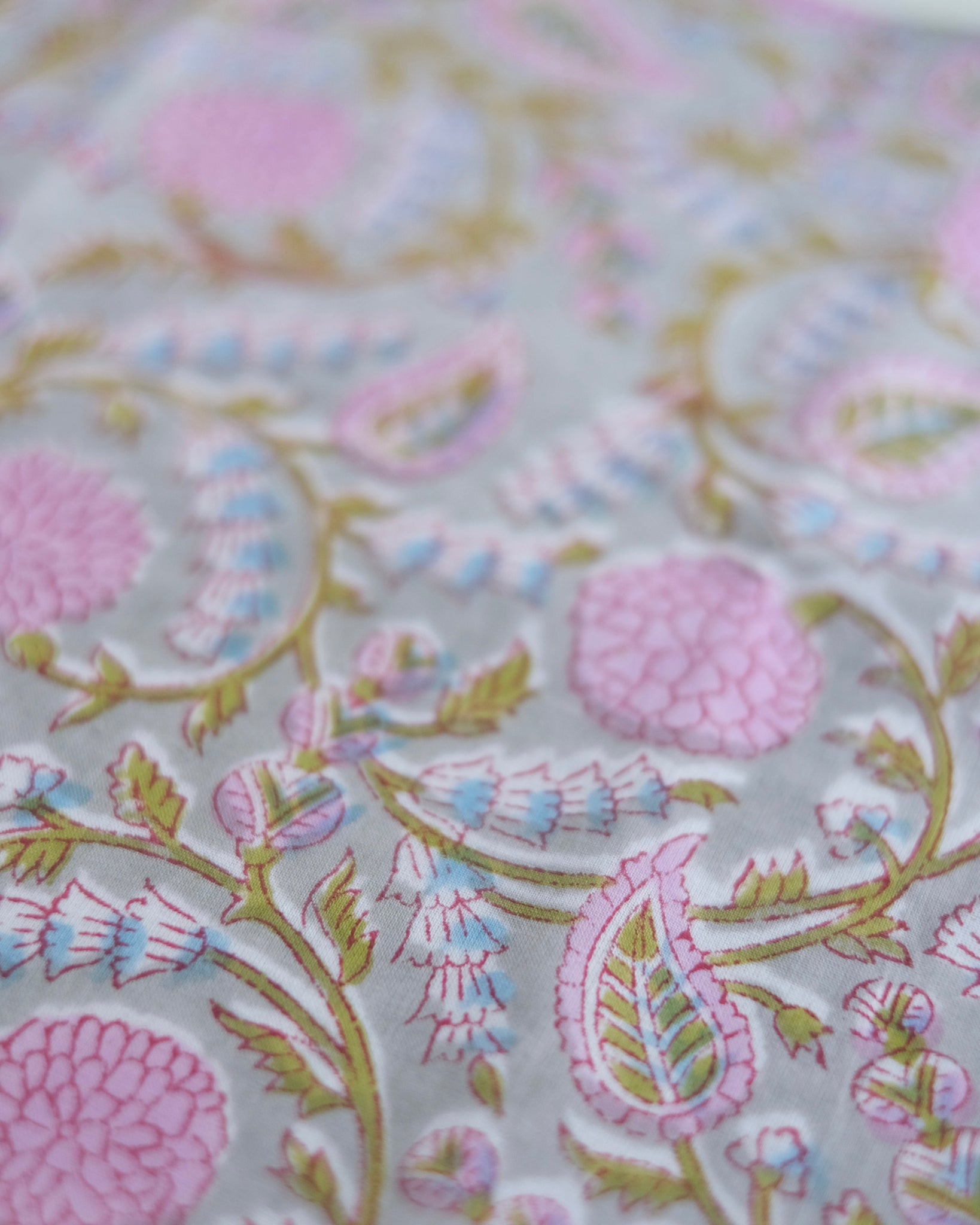 ブロックプリントは、インドで古くから伝わる染めの技法で、手彫りの木製の版木を生地に直接押して模様をプリントしていきます。手作業で行うため、わずかに版がずれていたり、色のかすれが見られたりするのもブロックプリントならではの味わいに。一色につき一つの版が必要なので多色の生地ではいくつもの版木を使います。素朴さが美しく、手仕事の温かさを感じることができる布です。