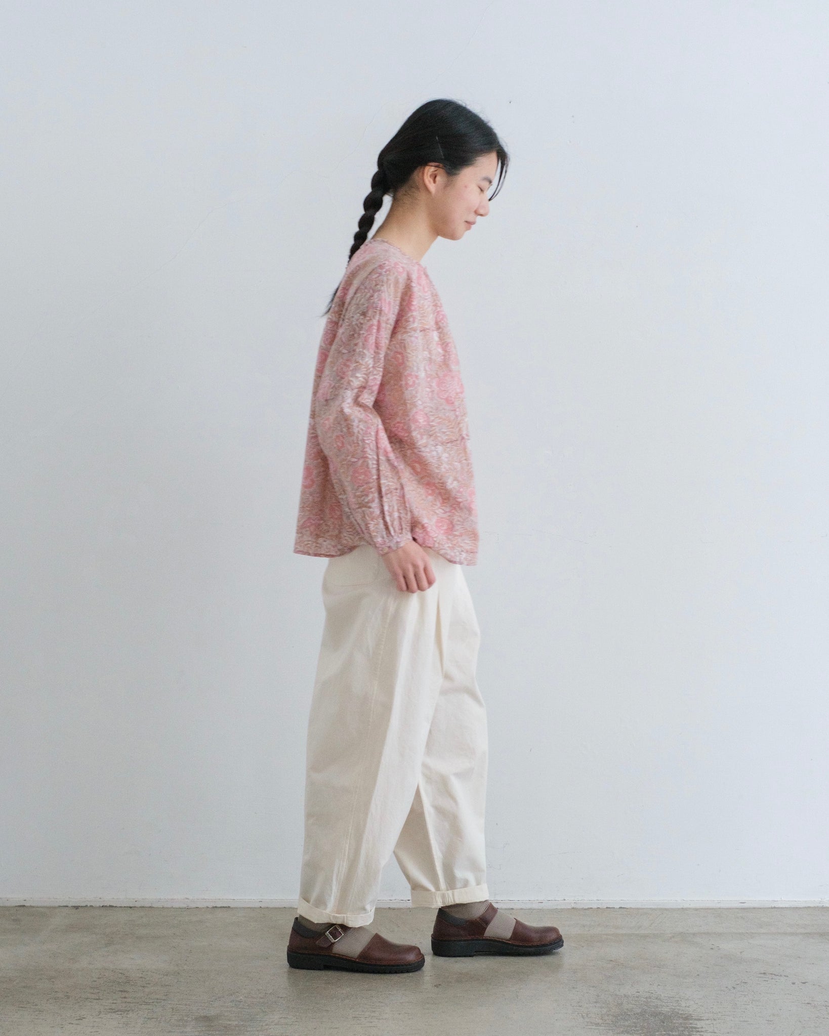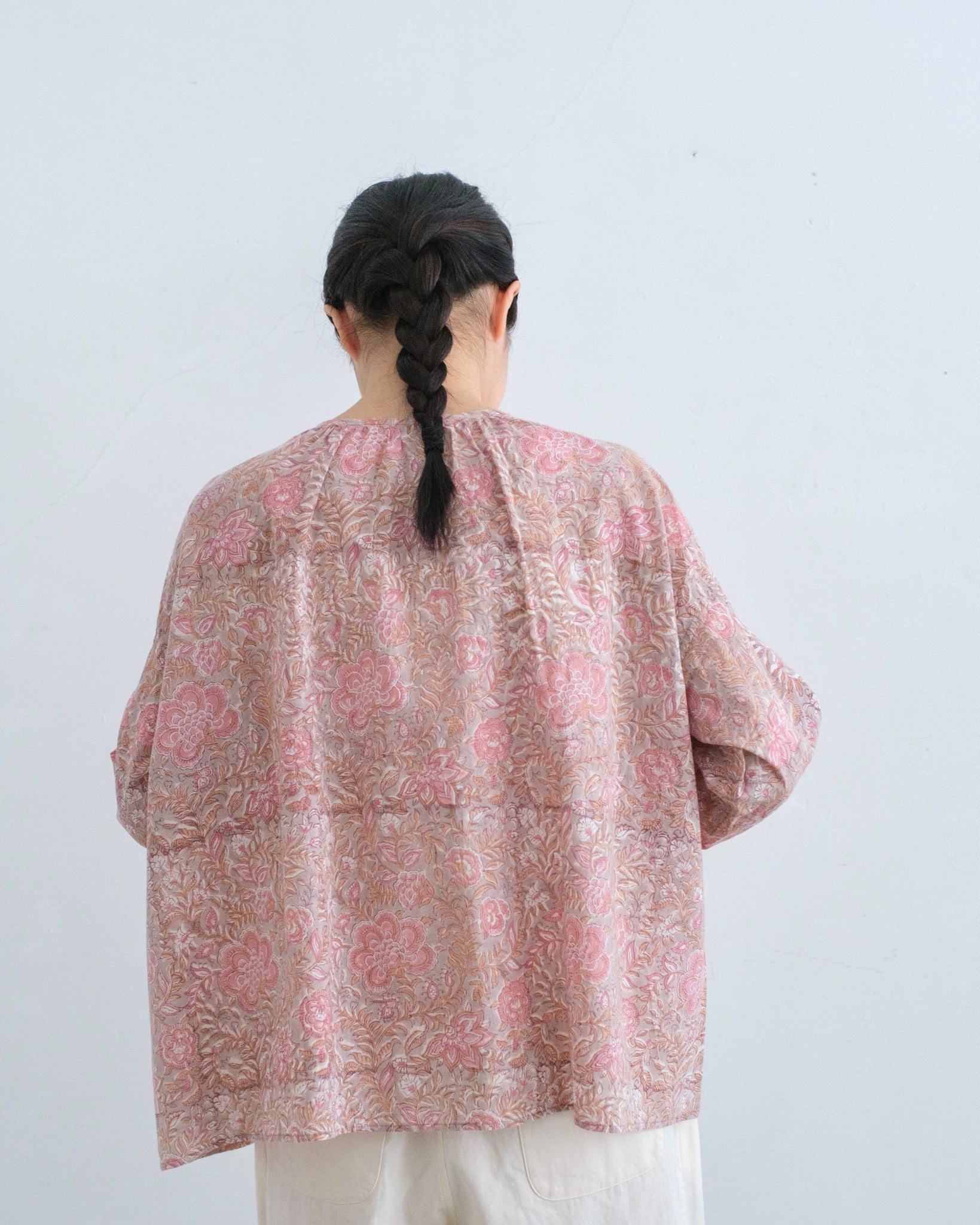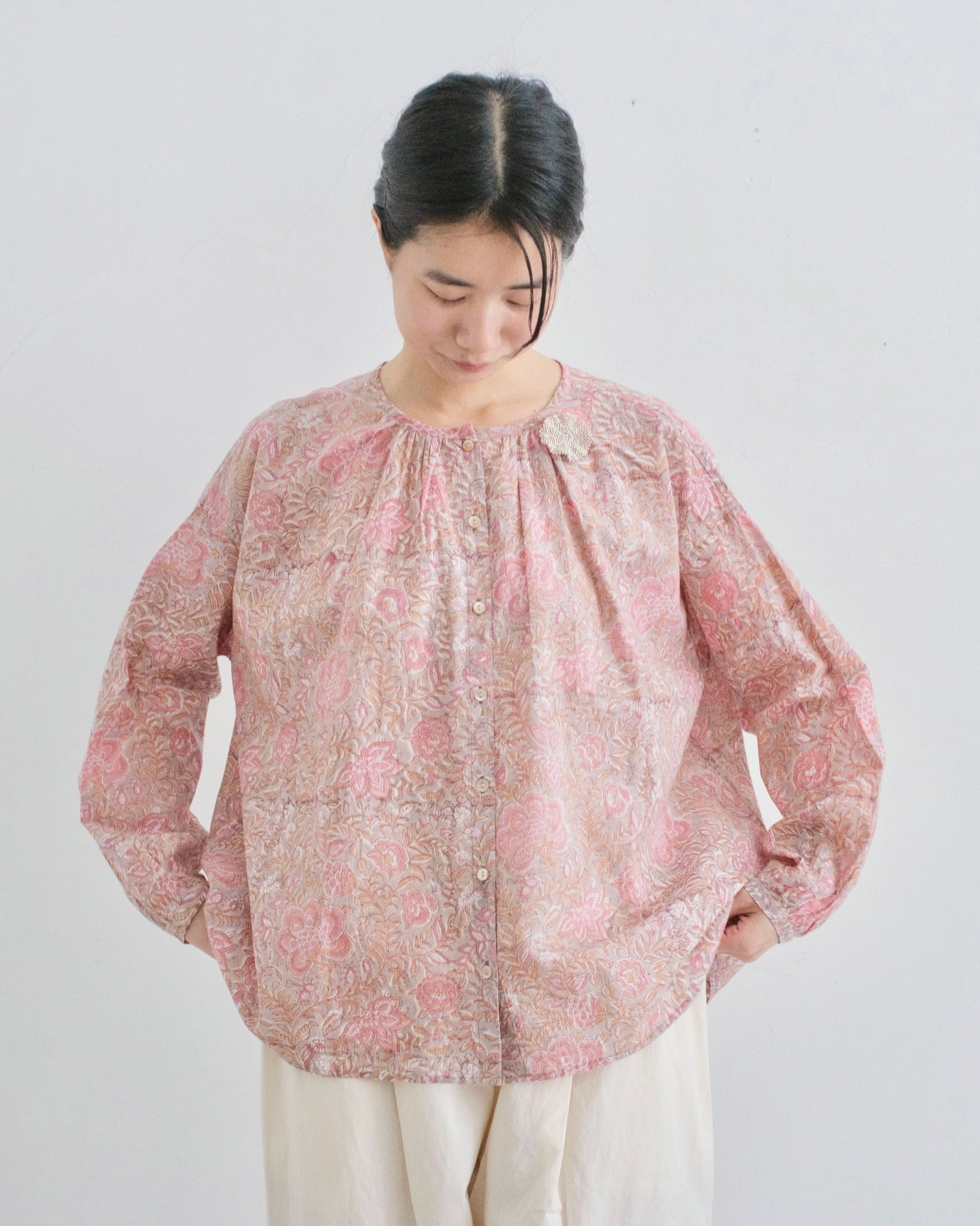 襟ぐりの前後にギャザーが入って、ふわりと広がるシルエット。袖口は約1cm幅のカフスに貝ボタン。