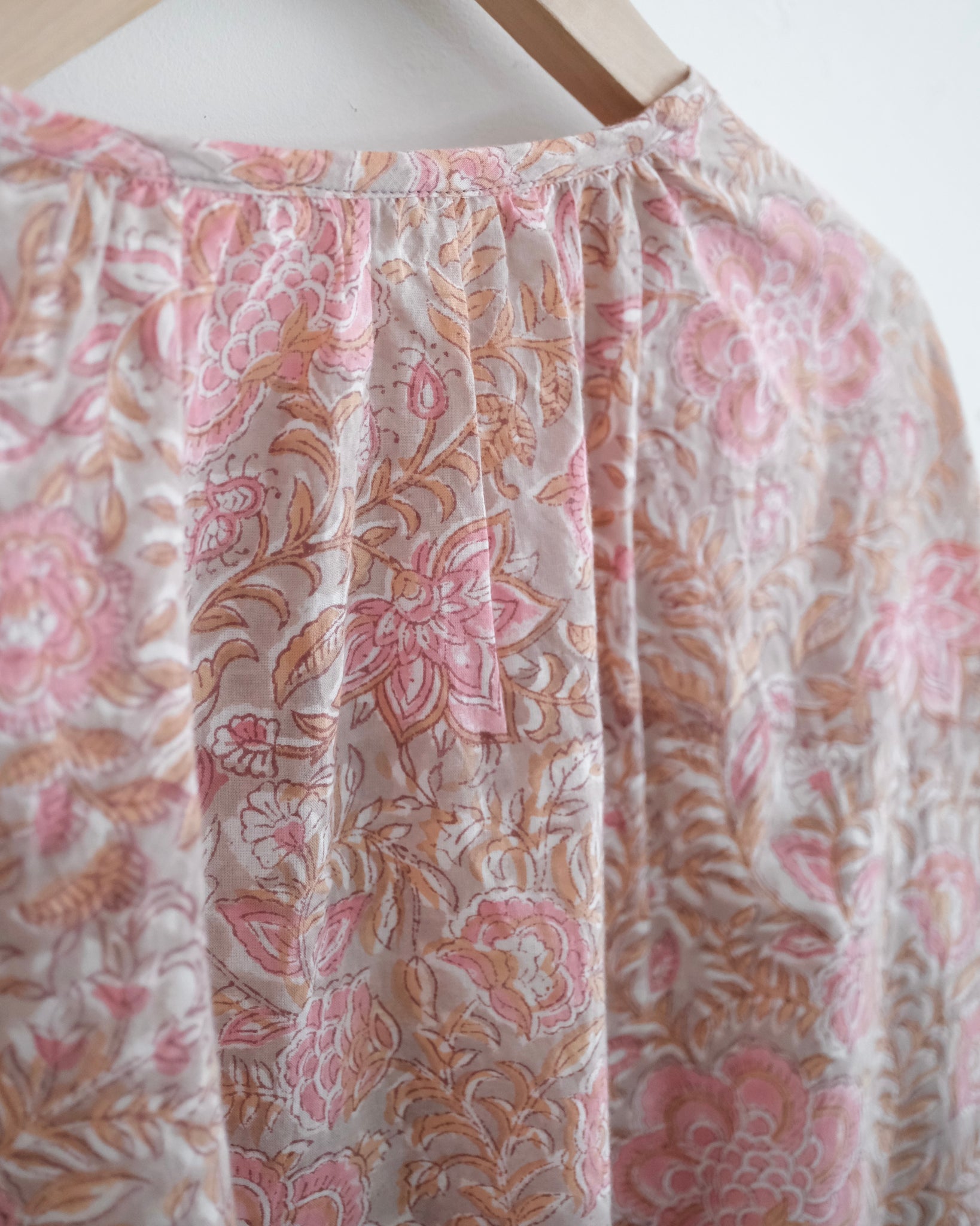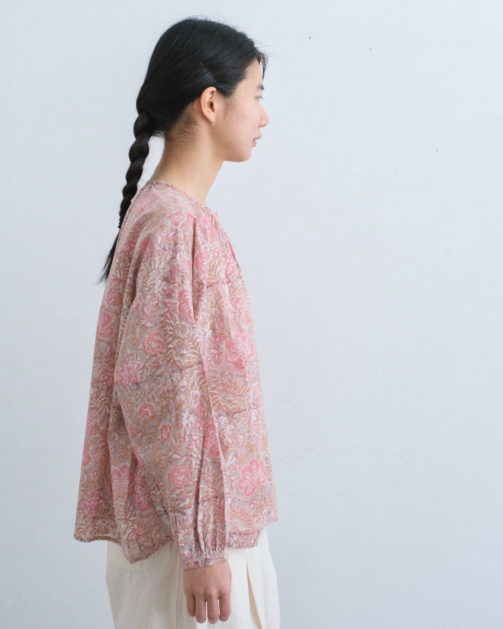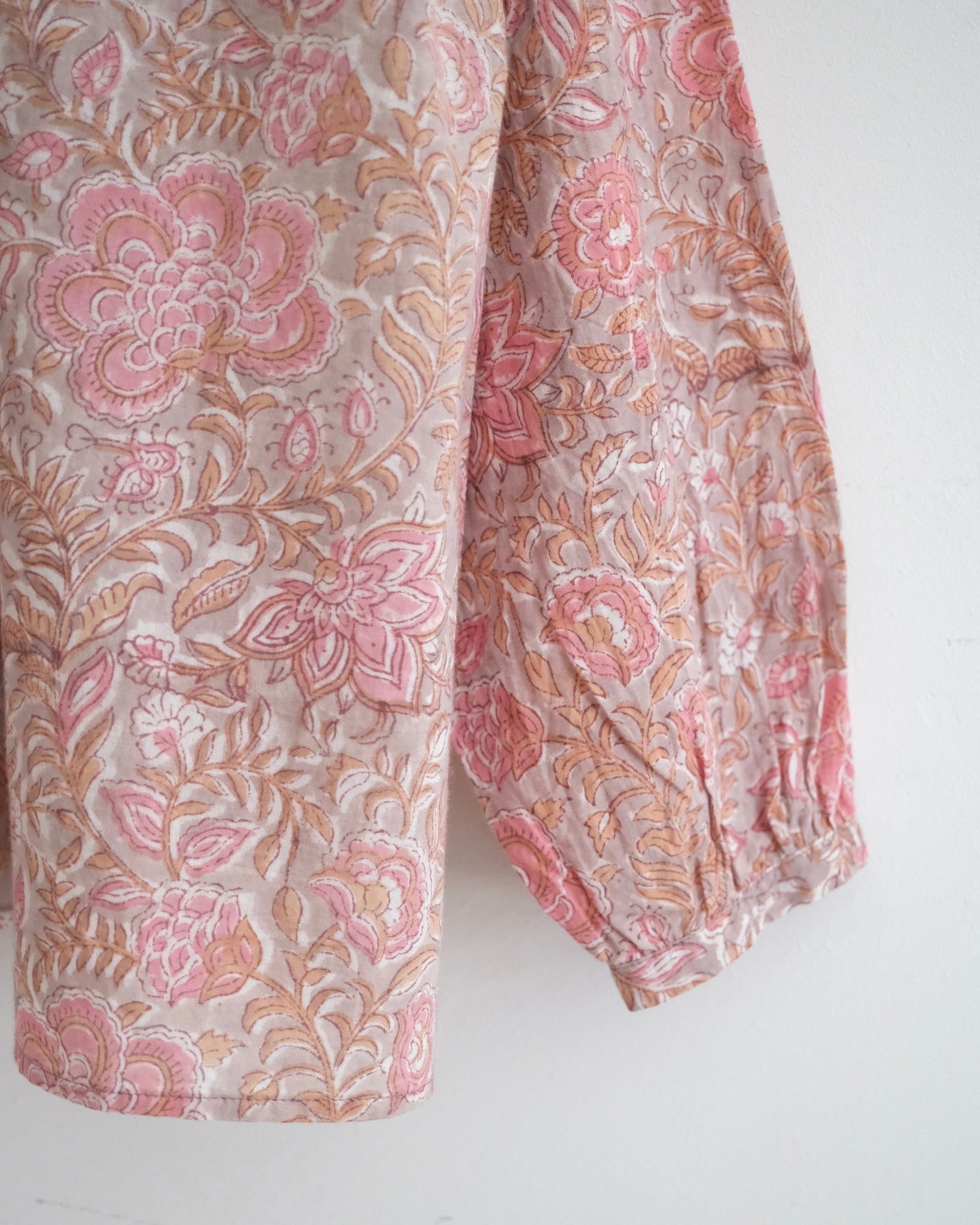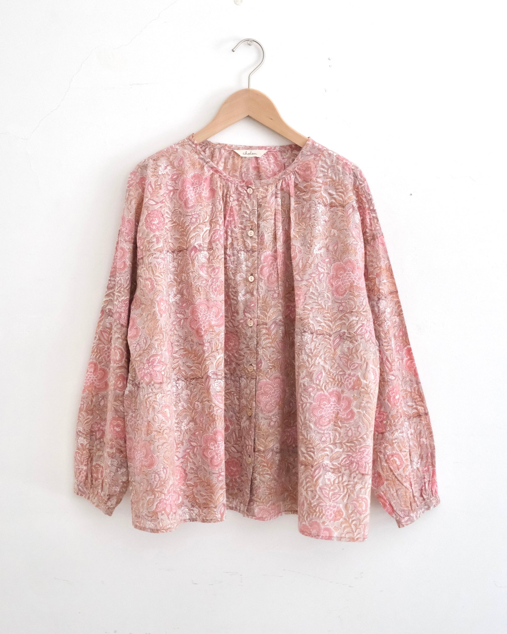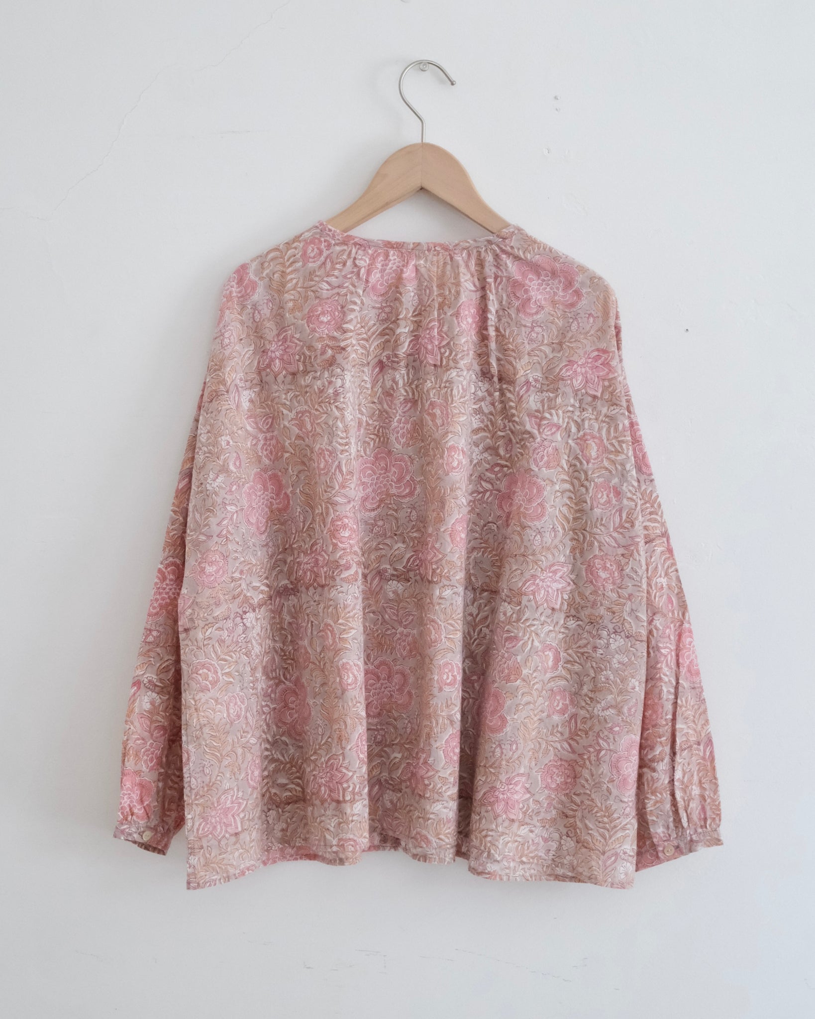 インドの手染め「ブロックプリント」生地を使った前開きの長袖ブラウス。やや薄手の軽いコットン素材でリラックスした着心地です。