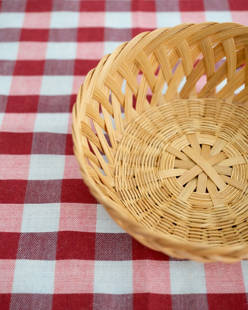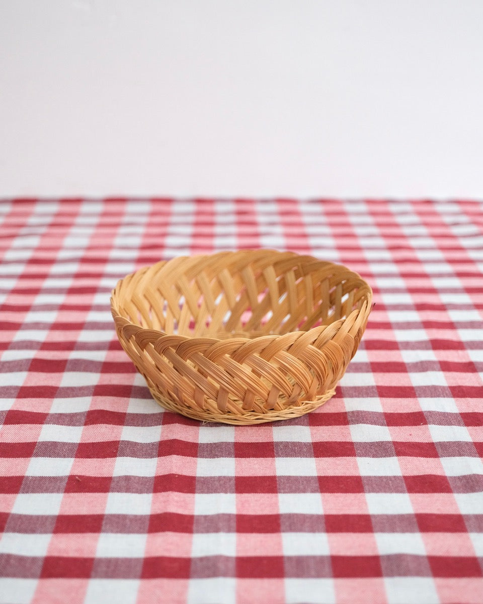 竹で編まれた、やや深さのある丸かごです。落ち着いたデザイン、しっかりしたつくりで、いろいろな用途に使えそう。